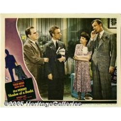 <B>Shadow of a Doubt (Universal, 1943).</B></I> Lobby Cards (2) (11" X 14"). Alfred Hitchcock directs this thrilling mystery about a quite California town and a family whose uncle (Joseph Cotten) comes to visit. The tension mounts as his niece, Teresa Wright, starts to suspect that her secretive and reserved uncle may be a serial murderer who is being pursued by the authorities. Very much one of the master's best. Offered in this lot are two scene cards. One card shows Wright going through her uncle's bag, searching for clues. The other shows Cotten with other members of the unsuspecting family. Other than a few trivial border imperfections and a couple of light, tiny scratches, the cards are in excellent condition. Near Mint. 2 items