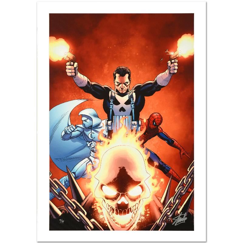 A piece of comic book history, this limited edition, from original art by John Cassaday, depicts the classic characters the Punisher, Ghost Rider, Spider-Man, and Moon Knight. Starting his work for Marvel in 1997, John Cassaday is best known for his work on Astonishing X-Men with Joss Whedon and Captain America with John Ney Rieber. "Shadowland #3" is a numbered limited edition giclee on canvas by John Cassaday presented by Marvel Comics, hand signed by the great Stan Lee! Includes Certificate of Authenticity! Measures approx. 18" x 27" (image).