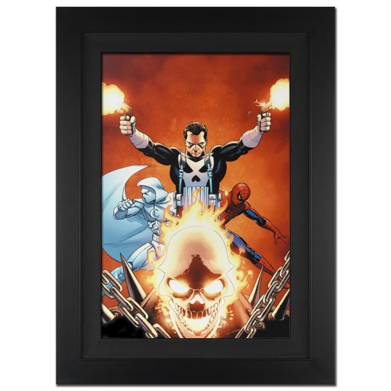 A piece of comic book history, this limited edition, from original art by John Cassaday, depicts the classic characters the Punisher, Ghost Rider, Spider-Man, and Moon Knight. Starting his work for Marvel in 1997, John Cassaday is best known for his work on Astonishing X-Men with Joss Whedon and Captain America with John Ney Rieber. "Shadowland #3" is an extremely limited edition giclee on canvas by John Cassaday presented by Marvel Comics, hand signed by the great Stan Lee and numbered out of only 10! This piece is custom framed and ready to hang. Includes Certificate of Authenticity! Measures approx. 25" x 34" (with frame), 18" x 27" (image).