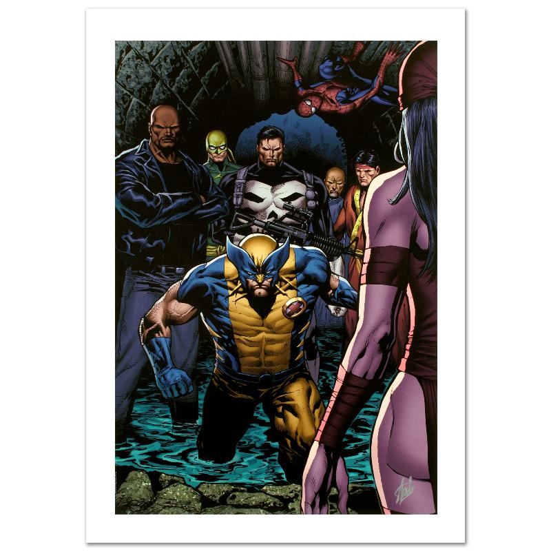 A piece of comic book history, this limited edition, from original art by Billy Tan, depicts Wolverine, Cage, Luke, Punisher, Iron Fist and Spider-Man. Billy Tan grew up in Malaysia and moved to the United States in 1989 to study business at the University of Kentucky. He began working as a penciler for Image Comics in the 1990s and soon became the regular artist of the Marvel Comics series Uncanny X-Men in 2006. In 2008, he was invited to draw New Avengers Secret Invasion tie-in issues #41 and 43-44. "Shadowland #4" is a limited edition giclee on canvas by Billy Tan presented by Marvel Comics, numbered hand signed by the great Stan Lee! Includes Certificate of Authenticity! Measures approx. 18" x 27" (image).