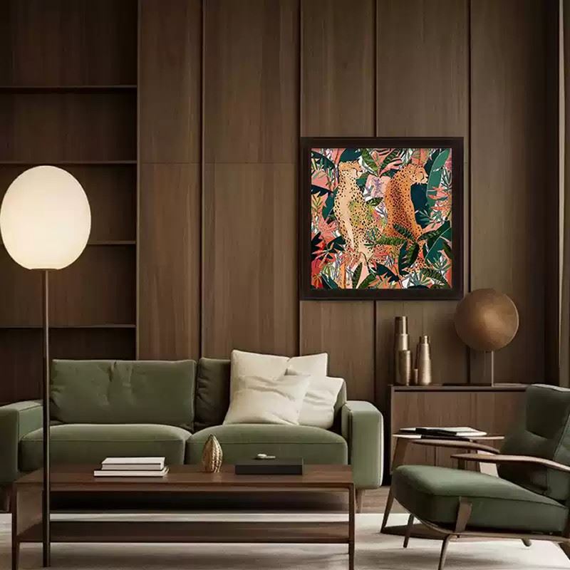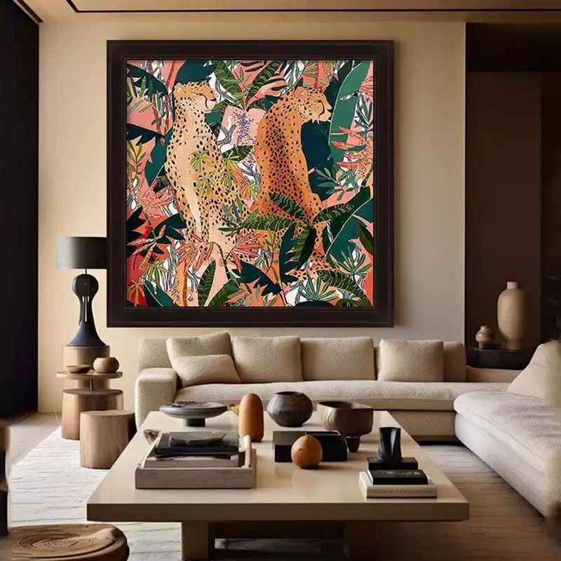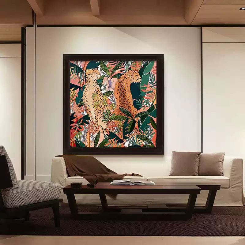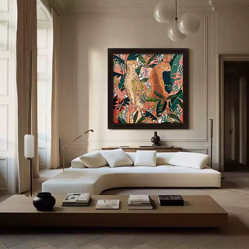 This artwork depicts two cheetahs resting in the jungle. The bold colors and intricate plant patterns combine to showcase the cheetahs' graceful posture and the harmonious coexistence with their natural surroundings. Dimensions: 28 x 28 inches.