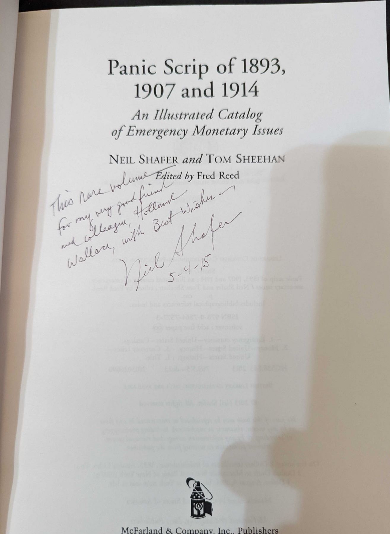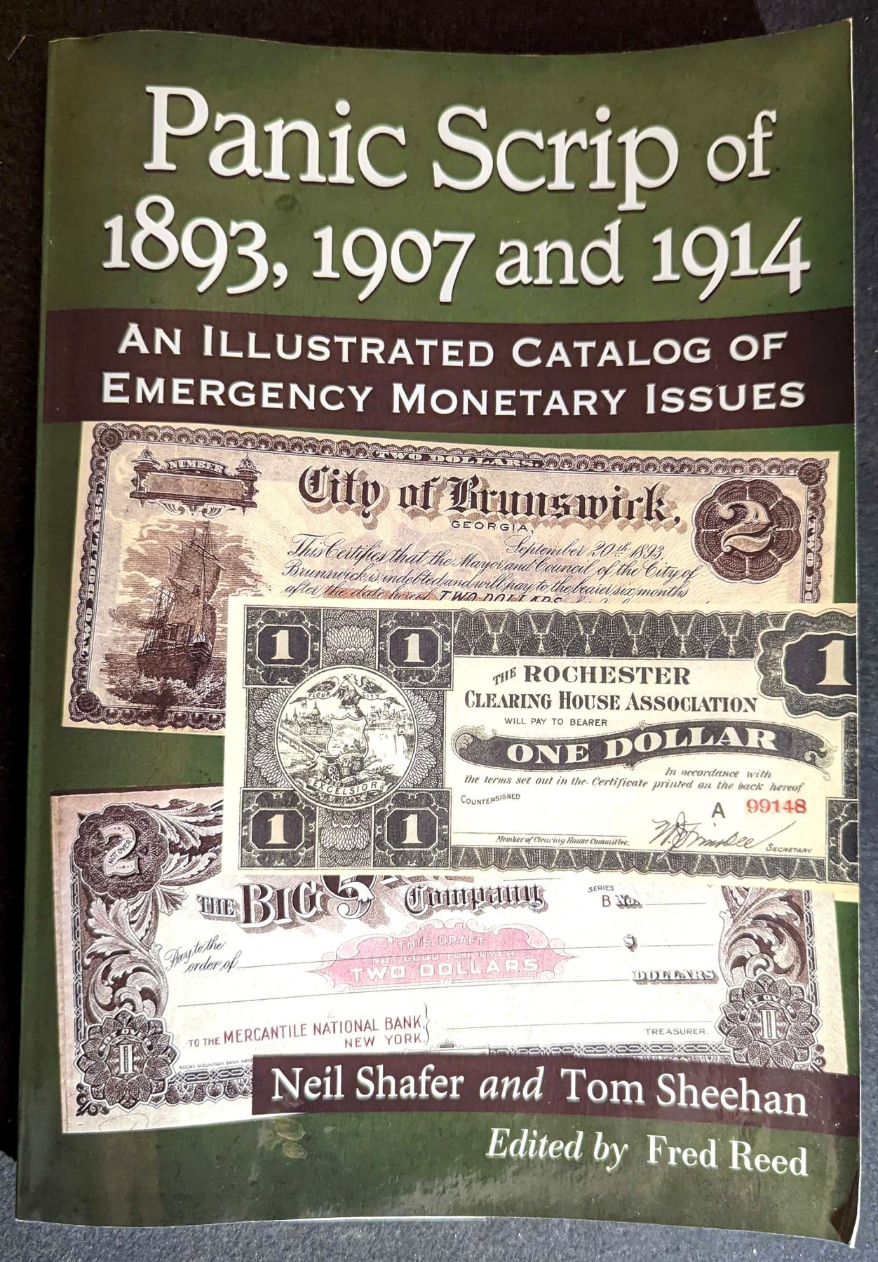 Shafer, Neil and Tom Sheehan. PANIC SCRIP OF 1893, 1907, AND 1914. McFarland & Company, Inc. 2013. 8vo. 400 pages. Original pictorial card covers. b&w plated throughout. Very Good. Inscribed by the author. This extensively illustrated work catalogs all known U.S. emergency currency issues of the panics of 1893, 1907 and 1914. Nearly 900 photographs show most types of these privately produced substitutes for money. The book also includes contextual historical information and authoritative appendices by Steve Whitfield on labor scrip and Loren Gatch on the background leading to these currency issues. Lot weight: 1 lbs 10oz. Subject(s): United States Paper Money - Panic Scrip.