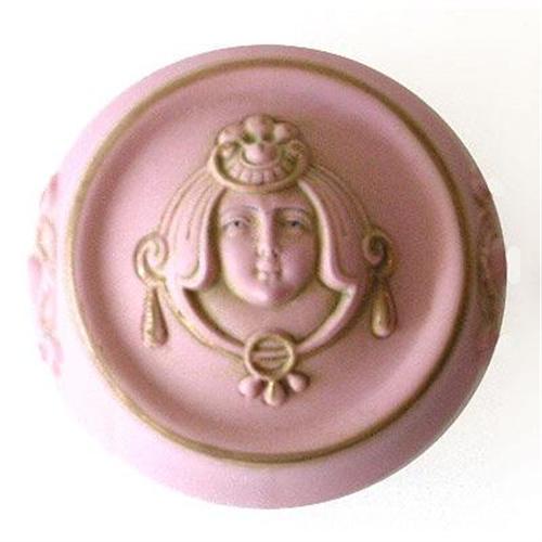 This round lavender pink jasperware dresser jar was produced by Schafer & Vater, circa 1900, The lid depicts in detailed and gold detailed bas-relief the head of an Egyptian Queen [perhaps Cleopatra] wearing a crown and other decoration. The base has matching ornaments front and back and has an Egyptian motif border surrounding the rim.. Measuring 3 inches tall x 4 wide. The bottom is marked with the Schafer & Vater crown and the number 4261 but the number is to faint be sure. This very lovely piece of delicate old Schafer & Vater jasperware pottery is, with the exception of a chip on the rim of the jar and one on the rim of the lid [see photo], in excellent condition