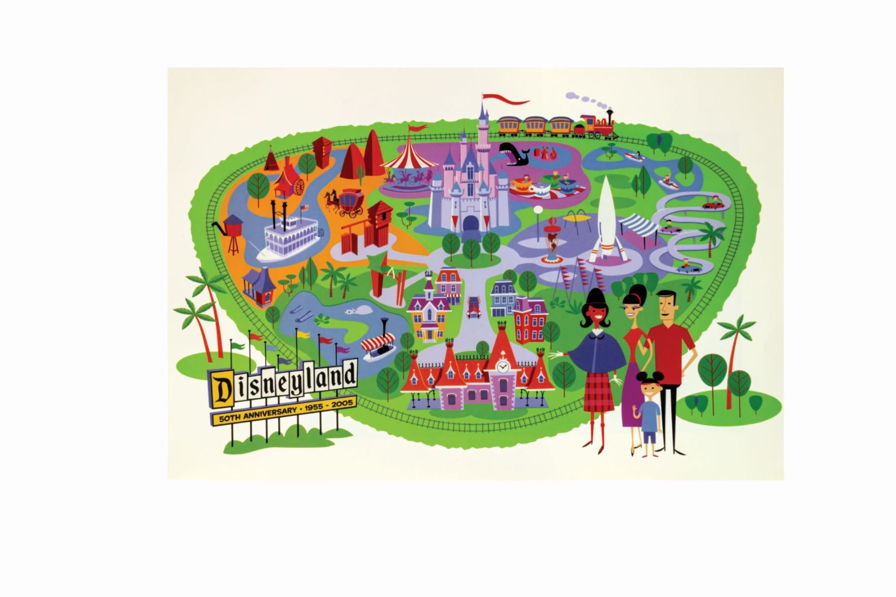 (Disneyland, 2005) A stylish map print by the artist Shag that was created for Disneyland's 50th anniversary. Depicting the park as it is remembered from its earliest years, this popular print measures 13"x19" and is in very good condition with minor edge wear.