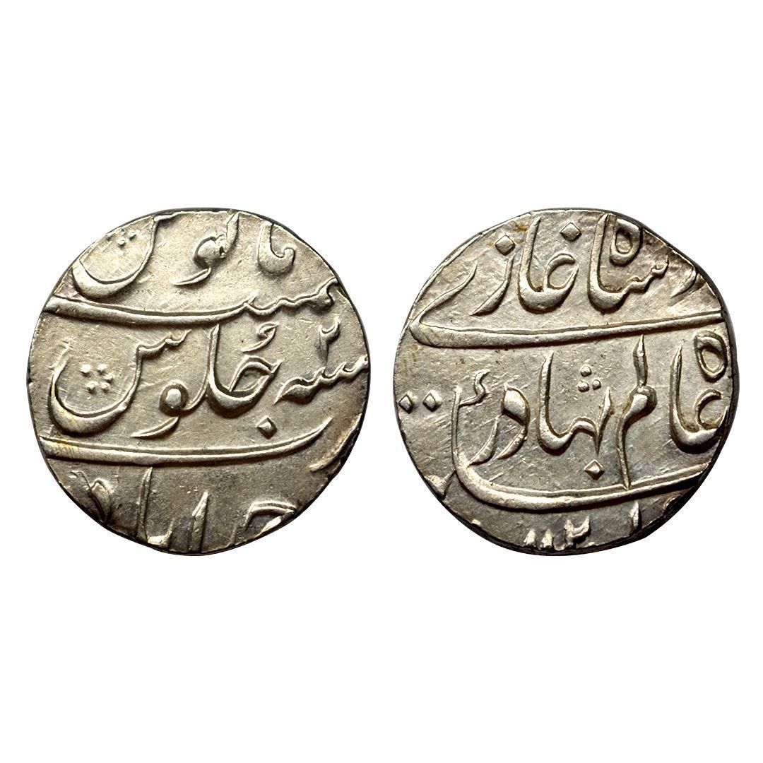 Shah Alam I, Rupee, Ahmedabad Mint, complete Mint name in the bottom line on rev, AH 1120, RY 2. No Test Marks, Almost UNC with lustre.