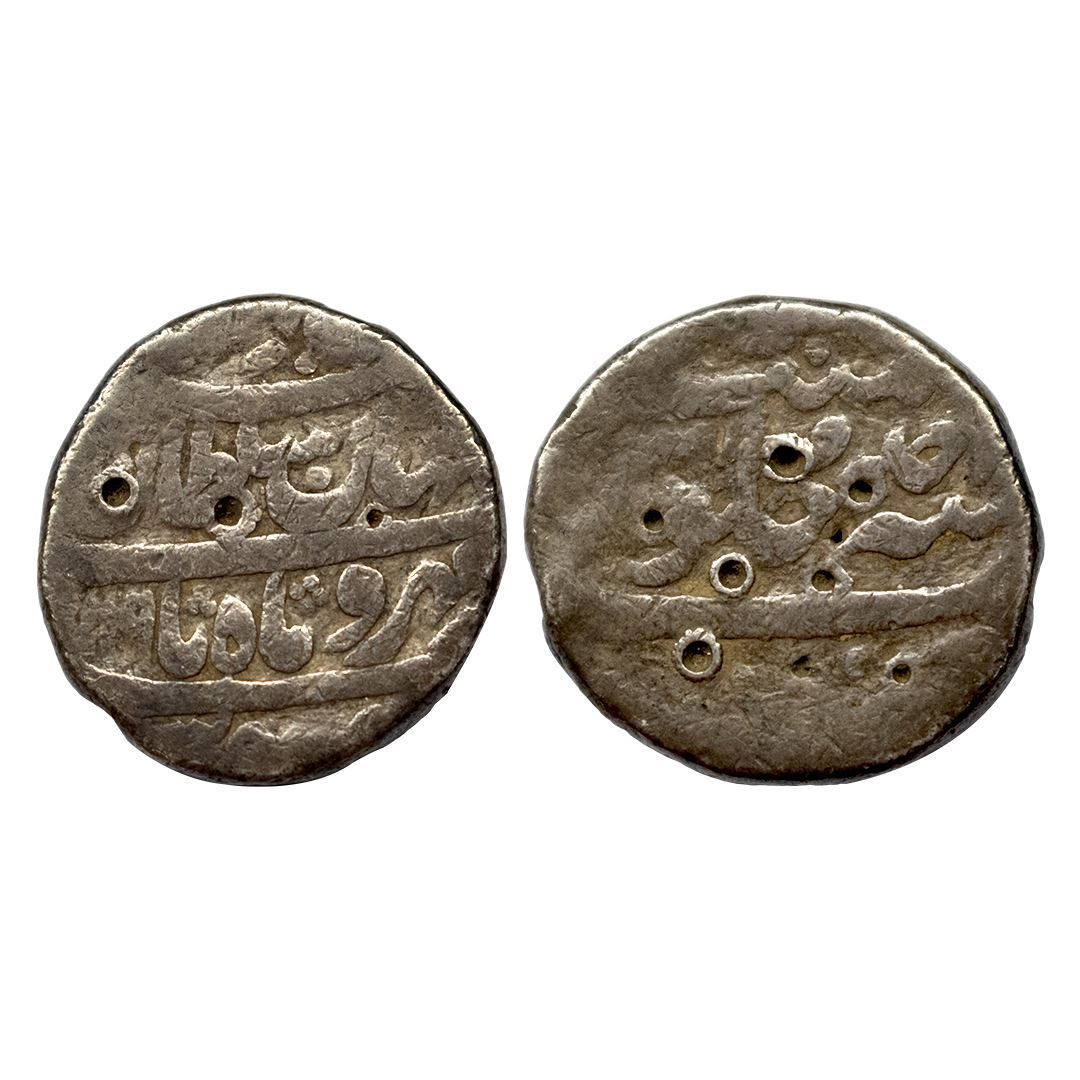 Shah Alam I as Muazzam (his pre-accession name), Rupee, Tatta Mint, Mint name in the bottom line on rev, Meher wa Mah couplet, AH 1119, RY Ahad. No Test Marks, Fine+, Very Rare.