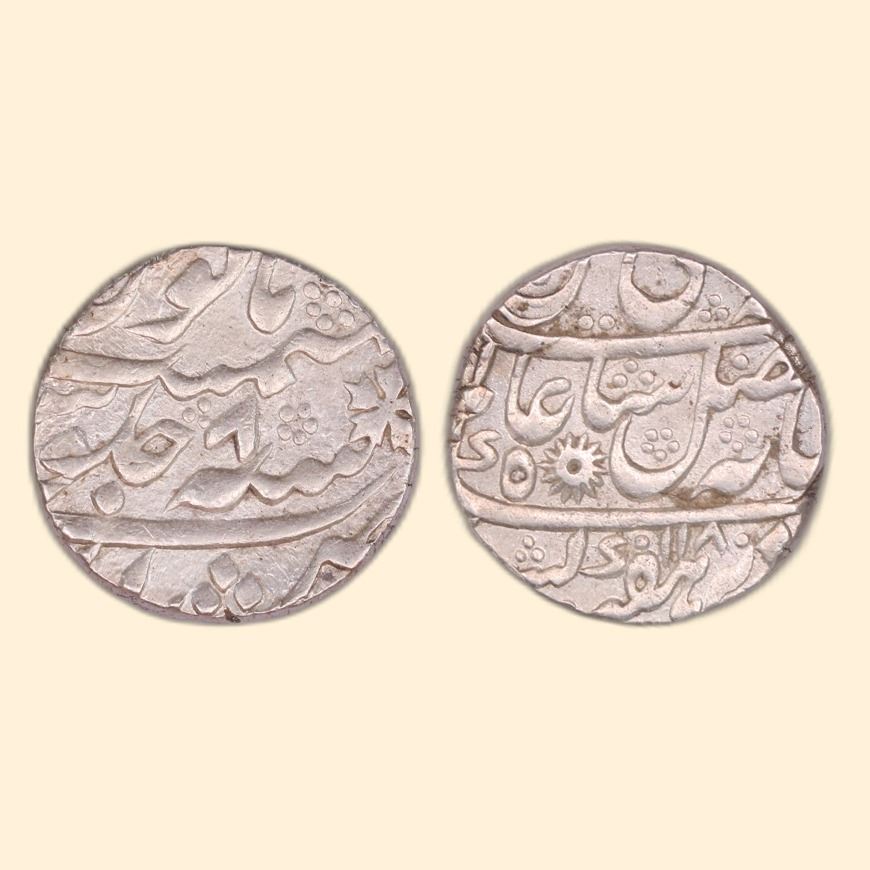 East India Company, Bengal Presidency, Murshidabad Mint, Silver Rupee, 11.66gms, AH 1180, RY 8, in the name of Shah Alam II, with sun symbol on obv. (Stevens # 2.74).