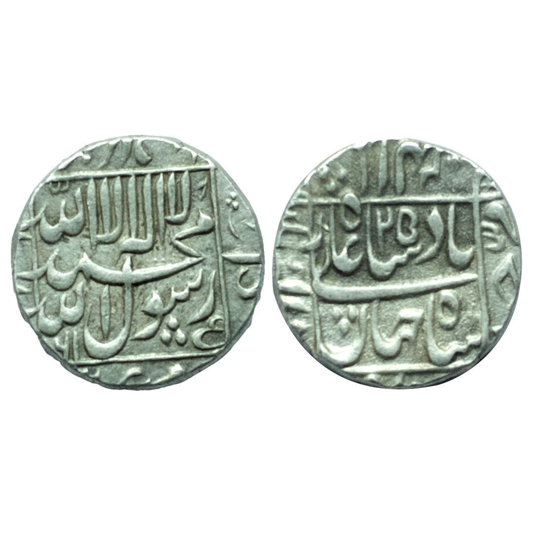 Shah Jahan (AH 1037-1068 / 1628-1658 AD), Silver Rupee, 11.48Grms, Akbarnagar Mint, AH 1061, RY 25, additional Persian letter ‘Ain’ below rasul on obv., both sides legend within square area. (KM # 235.4).