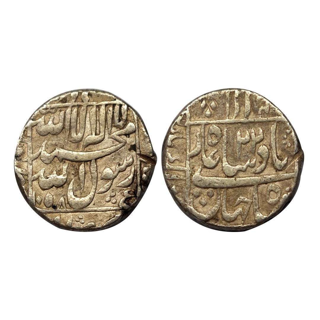 Shah Jahan, Akbarnagar Mint, Silver, Rupee, Square-area type with mint name in the left margin on rev, AH 1058, RY 22. Persian letter Ain (probably an initial of the Mint Master) placed under Kalima on obv, Centrally struck, Test marks, Extremely Fine+, Rare.