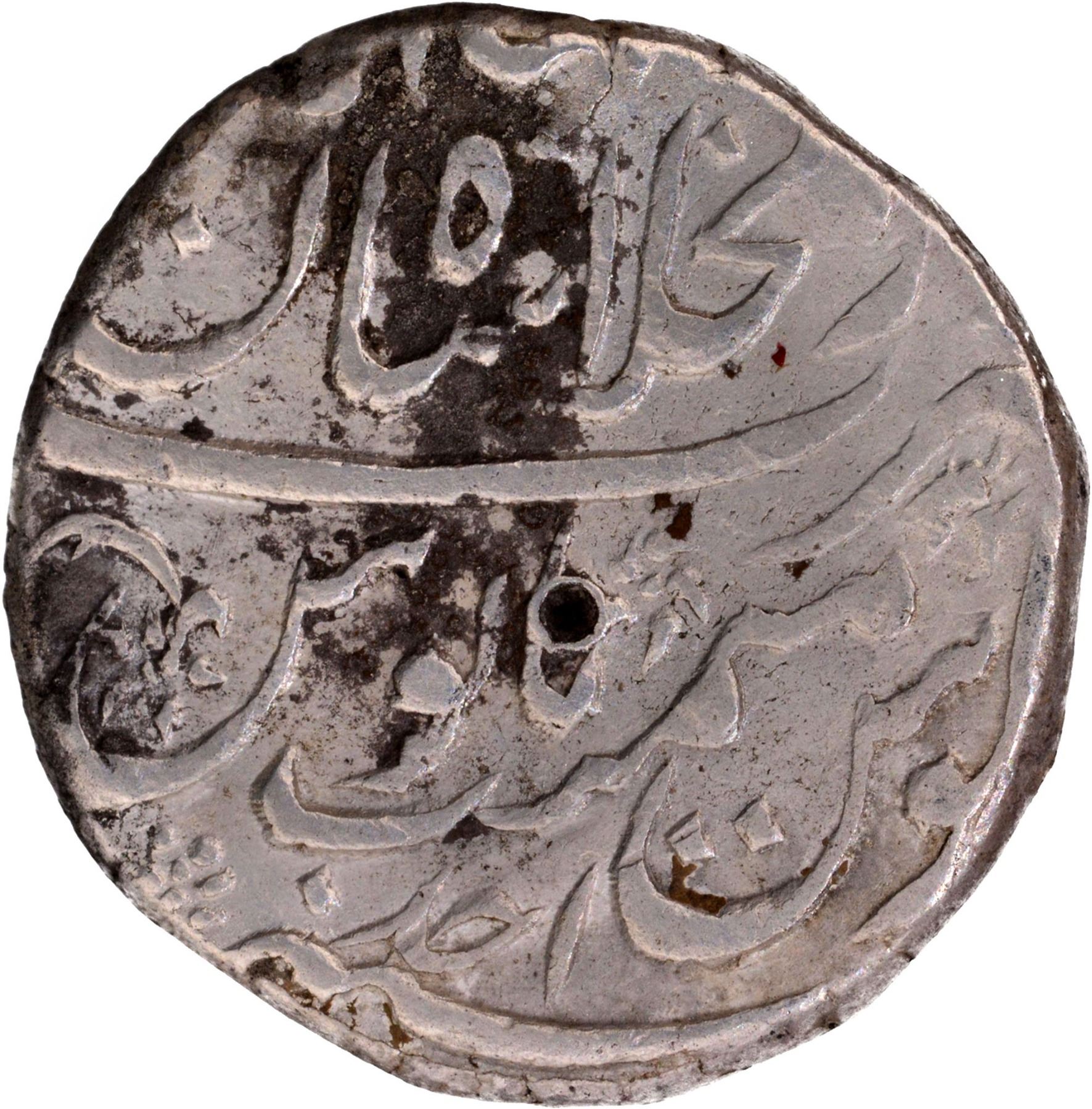Muhammad Ibrahim (AH 1132-1133 /1720 AD),Shahjahanabad Dar-ul-Khilafa,Silver Rupee,AH 113x/Ahad RY, Ba Fazle KareemCouplet,Obv: Persian legend Sikka zad dar Jahan bafazle Kareem, Shahan-e Shah Muhammad Ibrahim, Rev: Persian legend zarbShahjahanbad with epithet Dar ul Khilafa at the top,11.38g, 21.1mm,(KM # 426.1), single test mark, cleaned, otherwise about very fine,Extremely Rare.