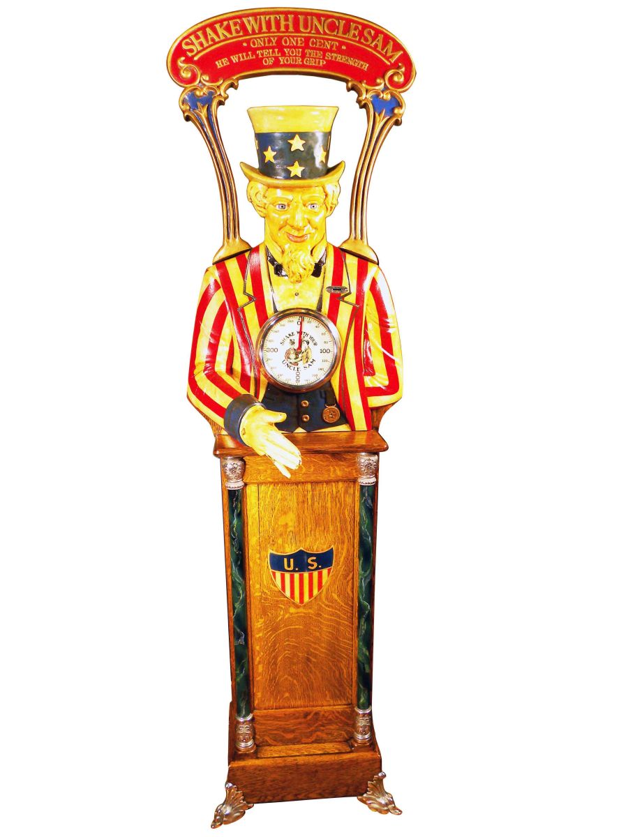Coin Operated "Shake with Uncle Sam" Gripper Machine. Cast iron and oak. Excellent working condition. Comes with key for machine and coin box. 20 X 77 X 16 inches.
