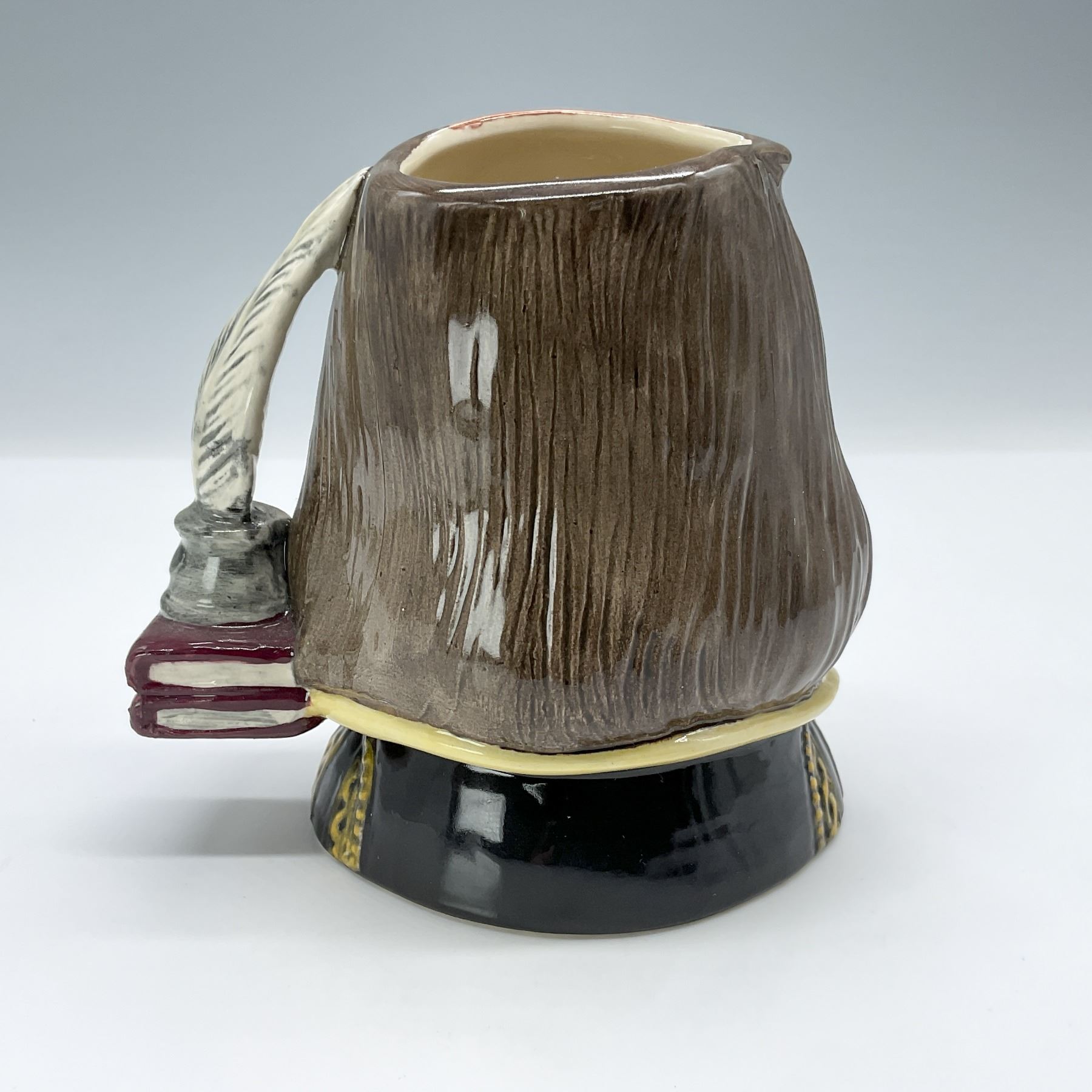 Black coat; yellow collar; light brown hair and beard; burgundy books; grey inkwell and quill. Royal Doulton backstamp.