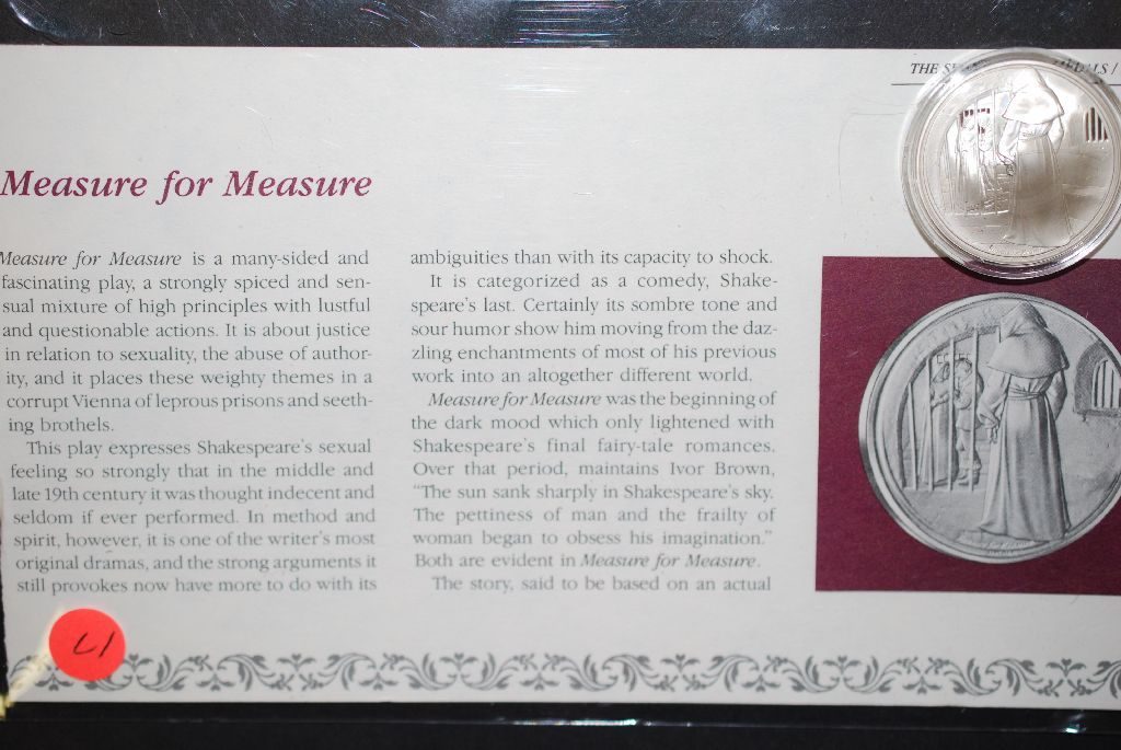 Shakespeare Tragedy Sterling Round; Measure For Measure; .925 Silver .540 Oz.