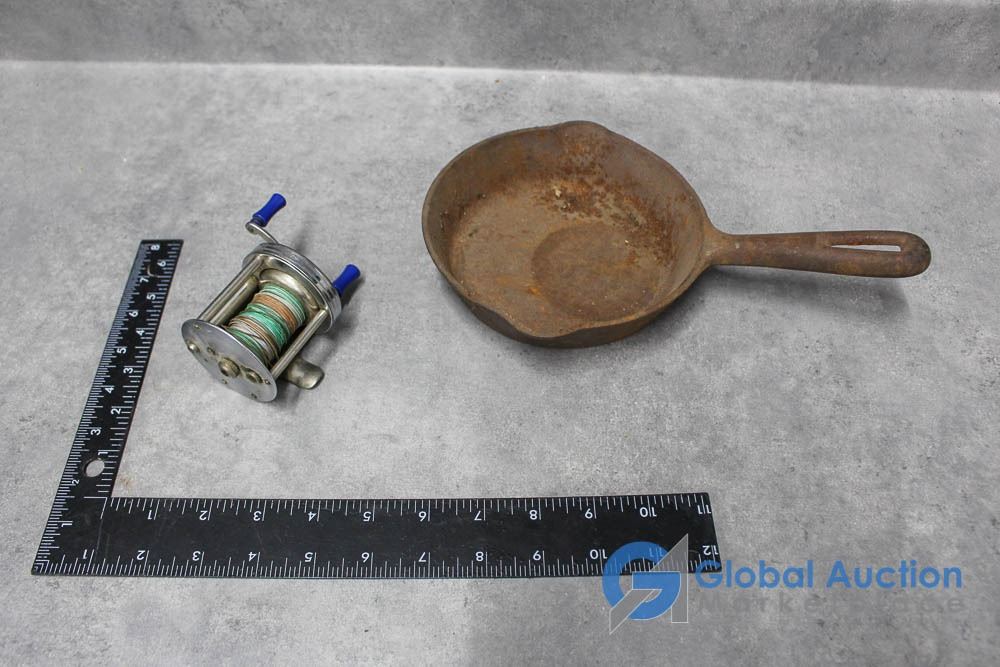 Shakespeare True Blue 1956 Fishing Rod Reel & Small Cast Iron Pan