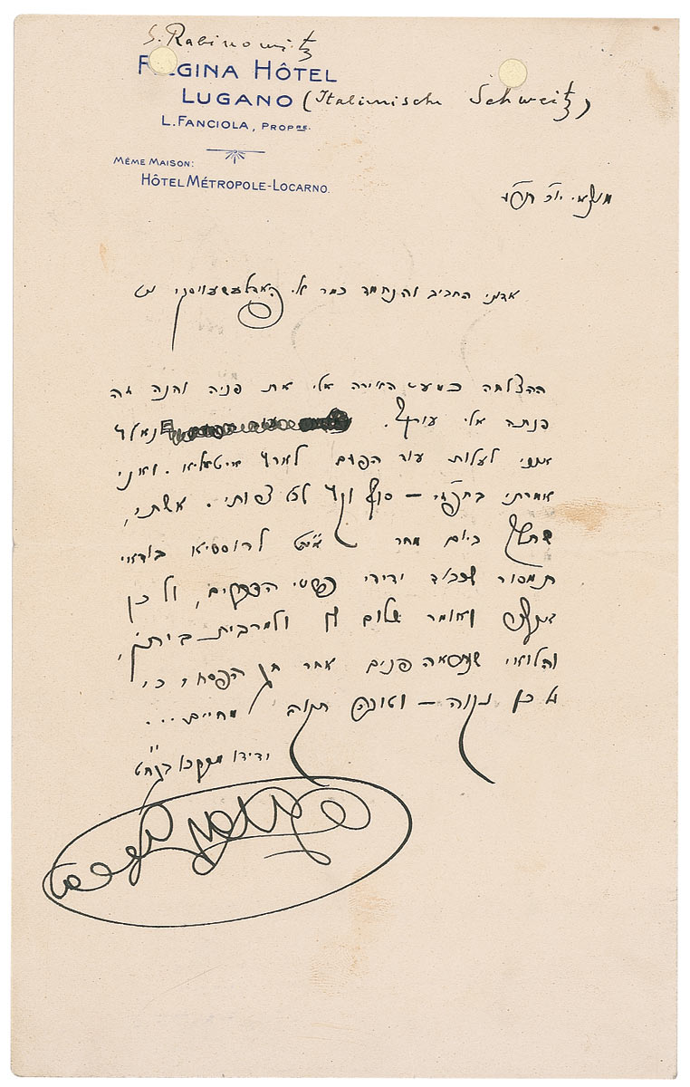 Born Solomon Rabinowitz (1859–1916), Russian-born Jewish humorist whose stories and plays, originally written in Yiddish, were the basis for the musical Fiddler on the Roof. ALS in Hebrew, one page, 5.25 x 8.5, Regina Hotel, Lugano letterhead. Writing from Switzerland, Aleichem states that he has to go to Italy again due to his illness, although he had hoped to be cured in 1908. He also writes that his wife is leaving for Russia and hopes to meet after Passover. In very good condition, with central horizontal fold, two punch holes to top edge, and scattered toning and soiling.