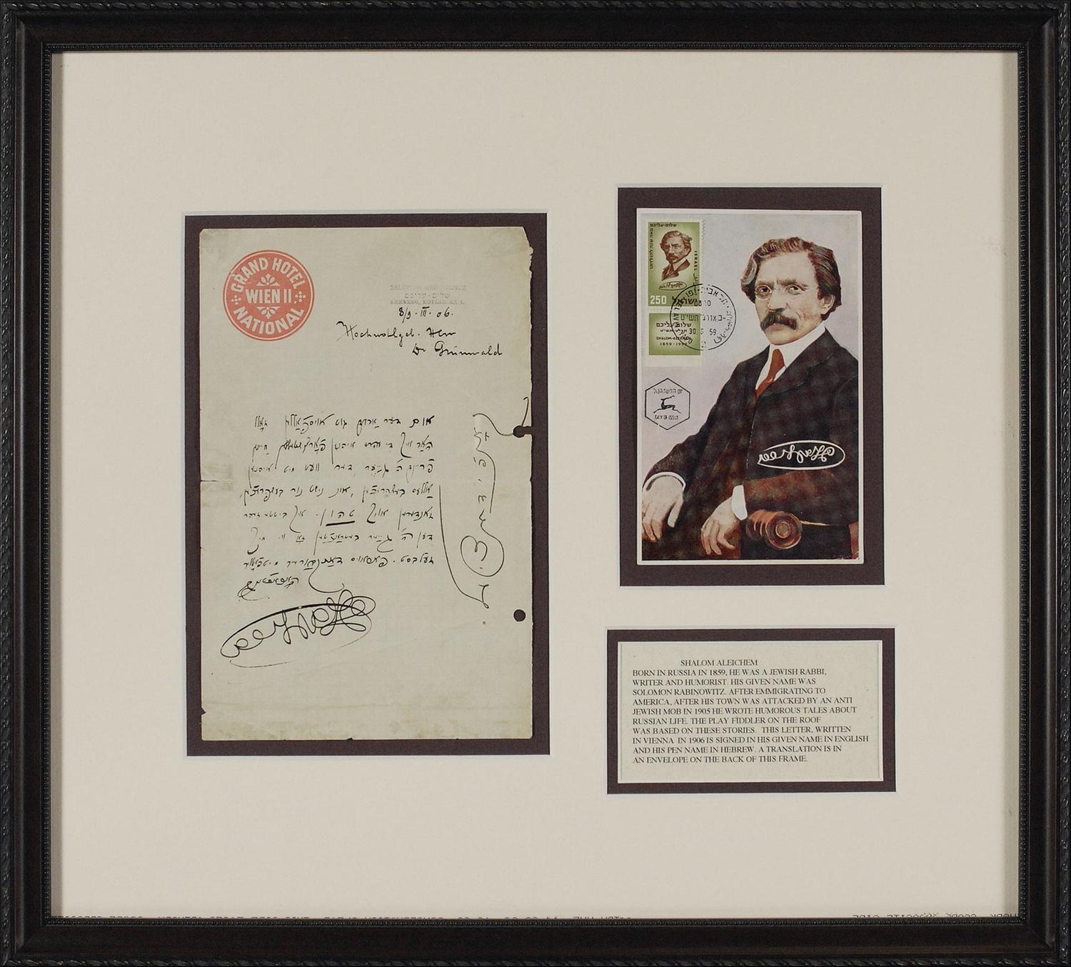 Born Solomon Rabinowitz (1859–1916), Russian-born Jewish humorist whose stories and plays, originally written in Yiddish, were the basis for the musical Fiddler on the Roof. ALS in Hebrew, one horizontally and vertically lightly-lined page, 5.75 x 8.75, Grand Hotel National in Vienna letterhead, March 8/9, 1906. In full (translated): “So that the evening will be successful I have the honor to present to you my friend Mr. Gayer who will talk about everything and not only talk but will also do it. I beg you to treat Mr. Gayer as you would me.” Also marked by him “Confidential” along right edge. Matted and framed with a 4 x 6 color postcard of Aleichem with an Israeli stamp affixed and postmarked May 30, 1959, to an overall size of 18.5 x 16.5. In very good condition, with a central horizontal fold, scattered creasing and wrinkling, toning and soiling, and two torn punch holes to right edge. A brief but charming piece of correspondence.