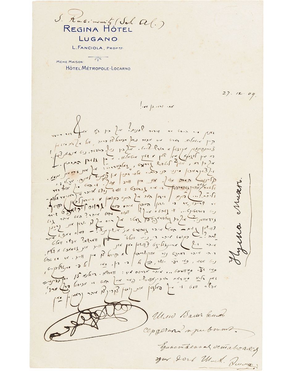 Russian-born Jewish humorist (1859–1916), whose stories and plays, originally written in Yiddish, were the basis for the musical Fiddler on the Roof. ALS in Hebrew, one page, 5.5 x 8.5, Hotel Regina letterhead, September 27, 1909. Letter to ben Amil. In part: “Again we are neighbors. I am here on my way to Italy, but it is still a little too early there, so I must stay here about a month…There isn't here, in Latin 'Zabladrit.' Me, my mother, and Maya. The family is dispersed. They're all in the land of Pniye. Even little Tamara, her also. And my wife. In my old age she made me lonely. She is right: What use is a sick Shalom Aleichem?…From the 'grandfather' I received a dear and wonderful letter today. He writes that the Jews, from much love, almost choked…God is punishing me. I wish to be with Jews but am dwelling among non-Jews…Maybe you would be willing to intercede between a husband and wife and make peace between them then…write a short letter to my wife that such a thing is not done, such is not right, such is not legal, such is not according to human behavior, such is not instinct." In fine condition, with a bit of scattered light foxing and some slight smudging to ink along horizontal fold.
