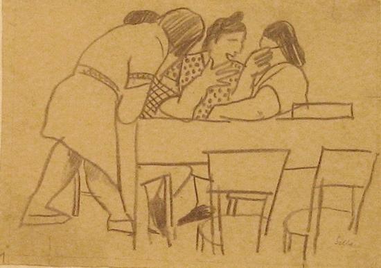 Shalom Sebba, German, Israeli Art, 1897 - 1975, The Dining Room in Kibbutz Afikim, Pencil, 15x21cm, Signed., , , , ,