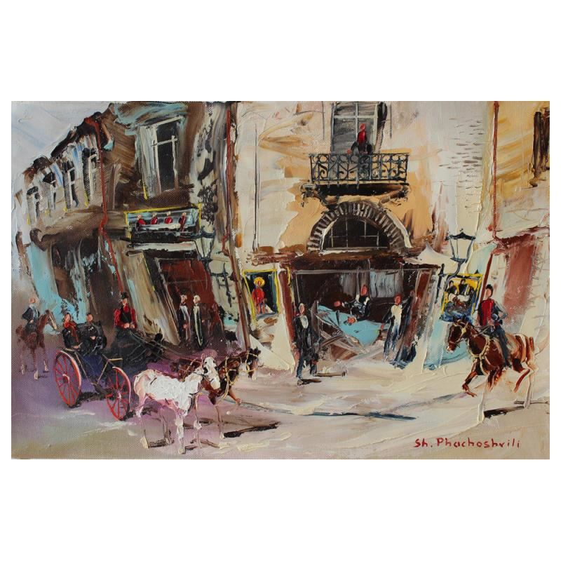 "Hotel" is an original Oil on Canvas by Shalva Phachoshvili. The piece is hand signed and comes with a Certificate of Authenticity. Measures approximately 15" x 10".