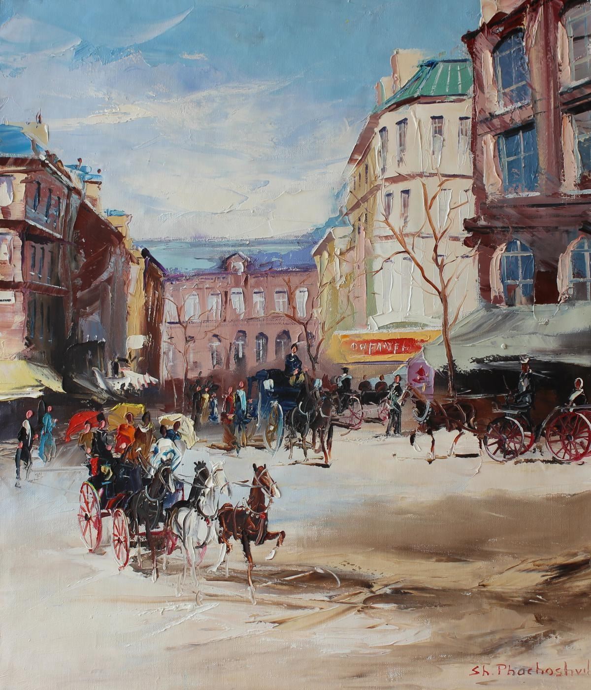 Artist: Shalva Phachoshvili. Medium: Original Oil on Canvas. Title: Horse-drawn Carriages. Size (Unframed): 21.5" x 18.5". Certificate of Authenticity: From the publisher. Reference# 10489.