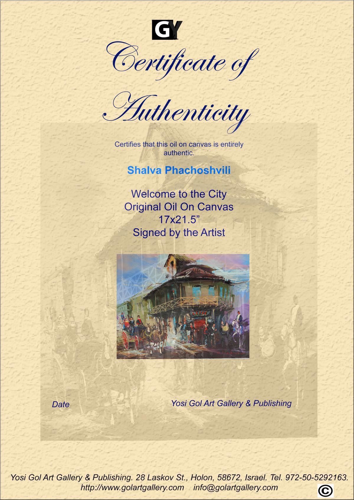 Artist: Shalva Phachoshvili. Medium: Original Oil on Canvas. Title: Welcome to the City. Size (Unframed): 17" x 21.5". Certificate of Authenticity: From the publisher. Reference# 10492.