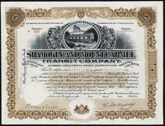 Shamokin, Pennsylvania, 1951, 75 Shares Issued and Cancelled, #509, Black on brown border and underprint, Trolley vignette top center, VF condition, E.A. Wright BNC.