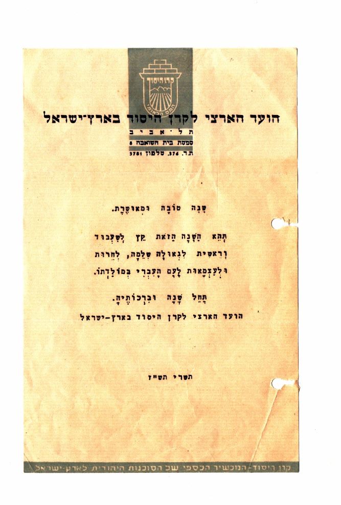 Shana Tova card of the National Committee of Keren Hayesod in Eretz Israel, 1947, good condition: two punch holes, two vertical folding marks. Dimensions: 13.5x21 cm.