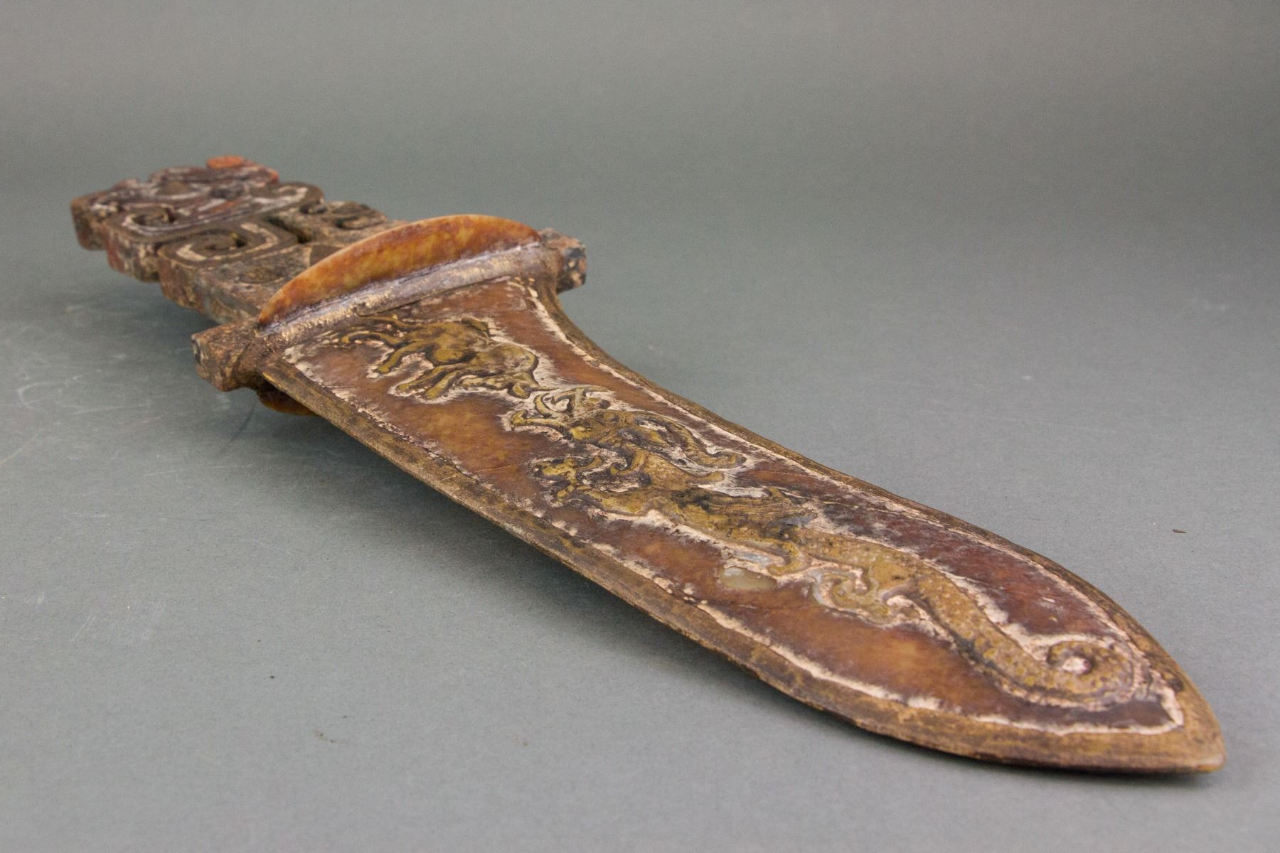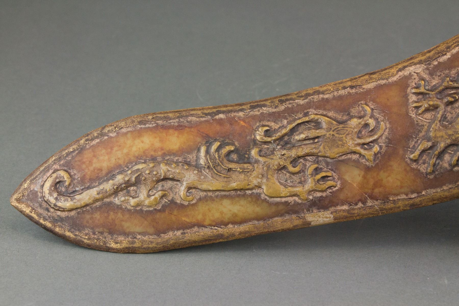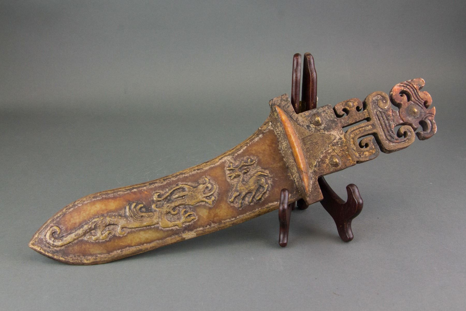 Shang or Zhou Dynasty archaic jade dagger; the blade decorated with raised crouching chilong dragon; with openwork carved Tao Mask handle; overall covered in gold powder; H: 5 cm, W: 12 cm, cracked and repaired; L: 43 cm, 845 grams