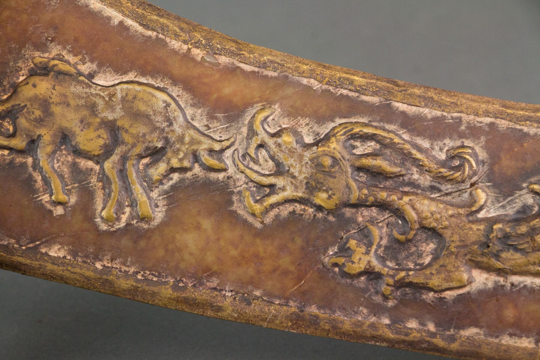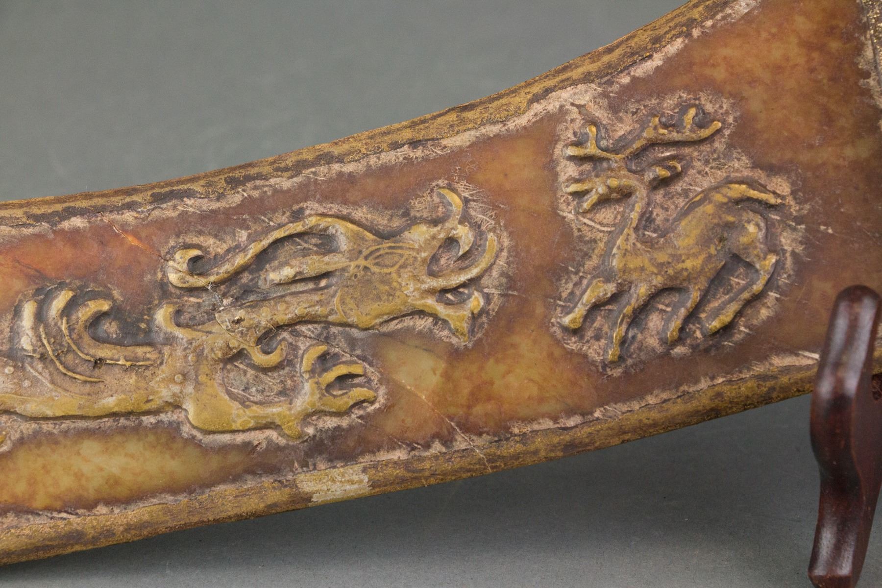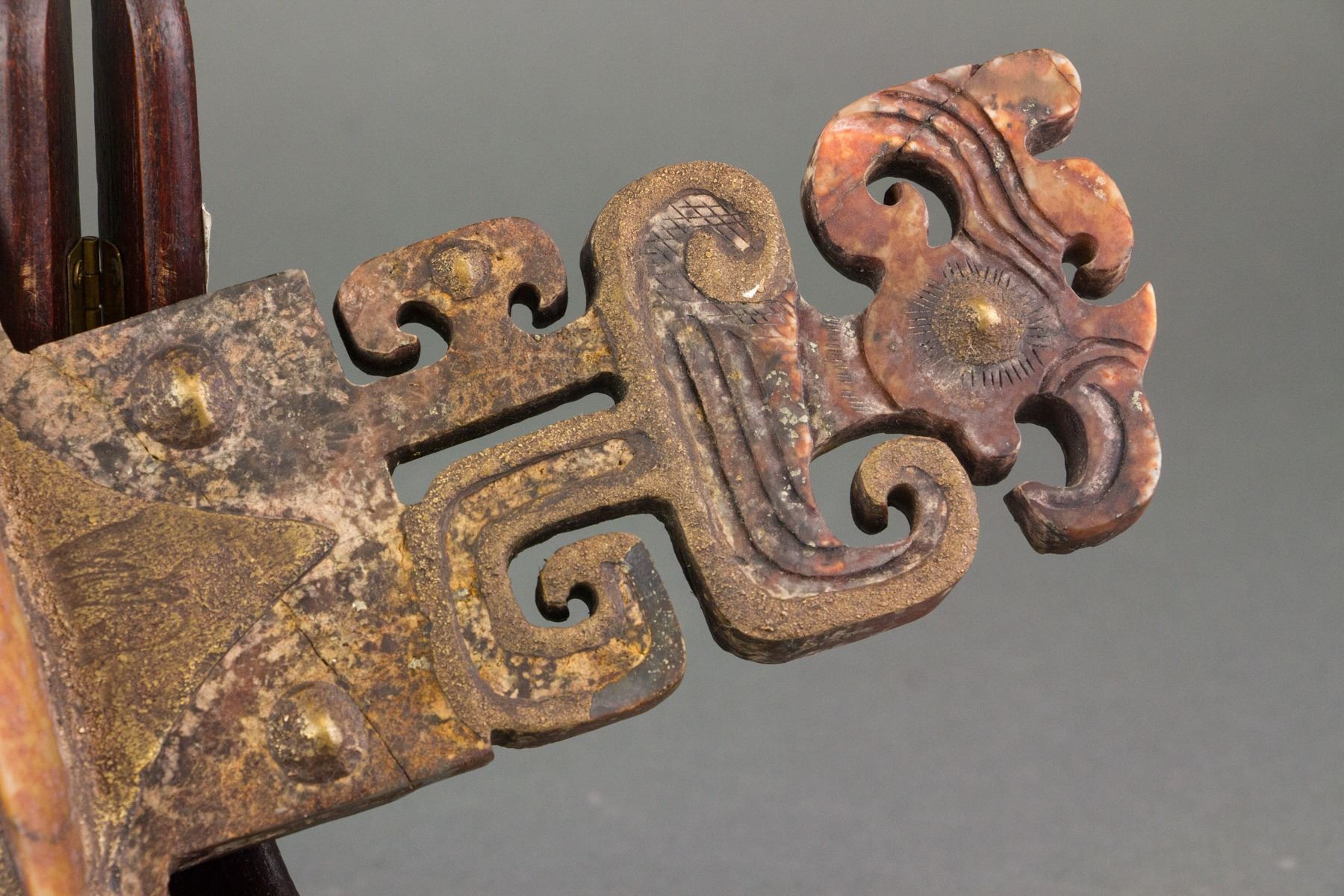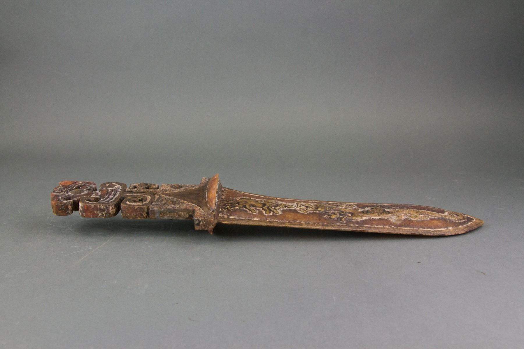 Shang or Zhou Dynasty archaic jade dagger; the blade decorated with raised crouching chilong dragon; with openwork carved Tao Mask handle; overall covered in gold powder; H: 5 cm, W: 12 cm, cracked and repaired; L: 43 cm, 845 grams