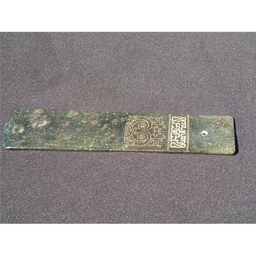 Shang dynasty, Anyang period, (circa 1200 BCE) green jade hatchet-axe. The hatchet is decorated in bas relief with C scrolls and cloud design in a similar way on both sides. One central perforation allow the suspension of this axe. This type of hatchet is well described in the collectors' textbook: "Jade, 5000 BC to 1912 AD, Guide to collectors", by Mircea Veleanu). Dimensions: 10.5" (26.5 cm.) length, 2.6" (6.5 cm.) width. Estimated value: $$6000-$7000.