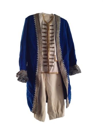 Shanghai Knights (2003) - Charlie Chaplin, played by Aaron Taylor Johnson. Blue velvet with silver embroidered trim coat, "Charlie #1 label" inside collar, cream colored vest with gold embroidery and gold trim, cream colored knickers with gold button closure at the legs and white suspenders. Includes wardrobe tag! Costume is soiled from use on the set of production.