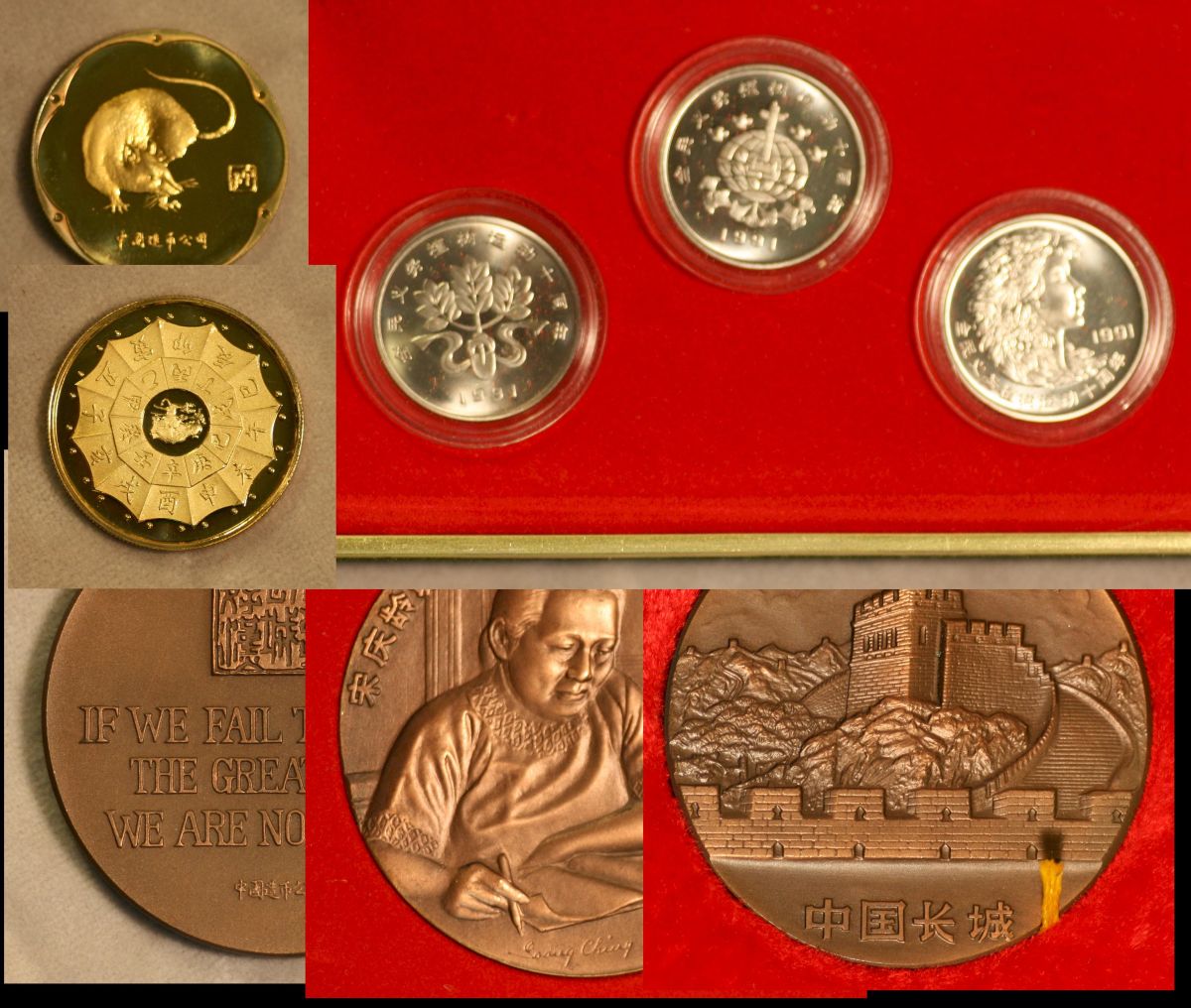 Shanghai Mint Medals/coins Lot of 11 pcs. Includes 2 x 60 mm antiqued copper medals. Obverse –The Great Wall. Reverse “If we fail to reach the Great Wall, we are no heroes”, 1993 medal commemorating100 years since the birth of Song Quing Ling, 60 mm antiqued copper. Obverse – Song Quing Ling, 60 mm antiqued copper. Obverse – Portrait of Song ; reverse – Song’s ancestral home in Beijing (20,000 issued), Year of the rat 30 mm copper alloy medal (proof) with presentation box, 1991 Tenth Anniversary of Tree Planting Movement. 3 – One yuan coins in nickel-bonded-steel (BU) and Set of four 35 mm copper alloy medals depicting exotic fish in graceful designs produced the Shanghai Mint with excellent craftmanship (proof). All medals packed in original cases.