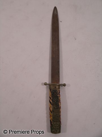 This is a prop, background steel blade dagger with ornately designed handle used by a 'Temple thug' in the 2000 Jackie Chan/Owen Wilson comedy-adventure 'Shanghai Noon.' The dagger blade is made from thin steel and has become rusted with age and use. The handle is crafted from glazed plastic and hand painted with brown stripes, and is has two thin, ornate metal strips covering the plastic handle. (measures approx. 13 1/2" long)