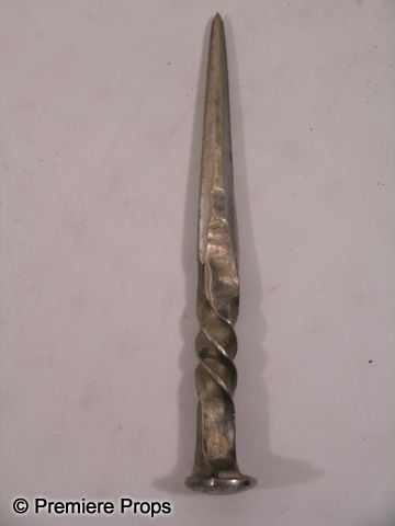 A prop, background twisted steel weapon used by a 'bad guy train worker' in the 2000 Jackie Chan/Owen Wilson comedy-adventure 'Shanghai Noon.' The weapon is made from a steel train track spike, with the handle carved into a twisted pattern which morphs into the blade. (measures approx. 10" long)
