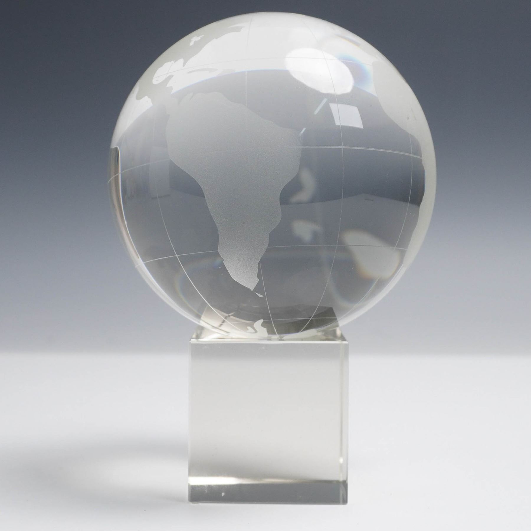 Shannon Crystal etched glass world globe featuring frosted continent detailing and latitudinal and longitudinal lines. The clear crystal sphere rests on a matching cube base, both finely crafted to reflect light and add visual depth. This display piece comes complete with its original Shannon Crystal box. Mounted piece measures 6"H. Box measures 6.5"L x 9"H.