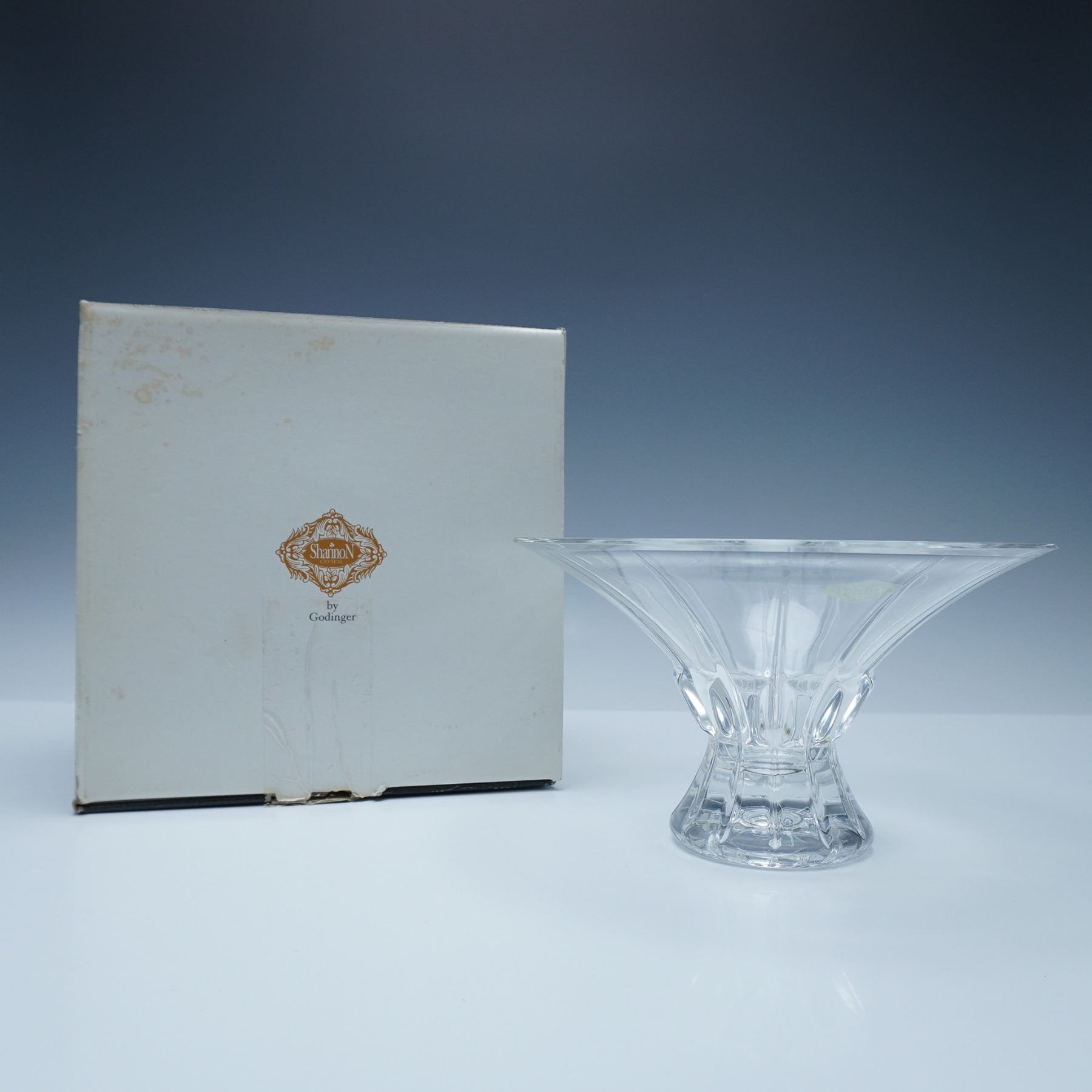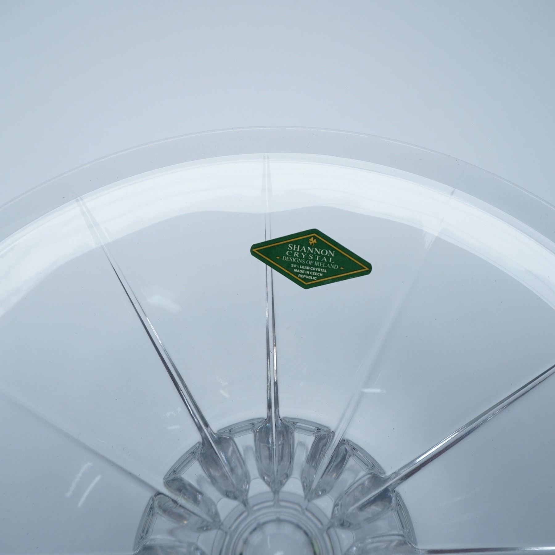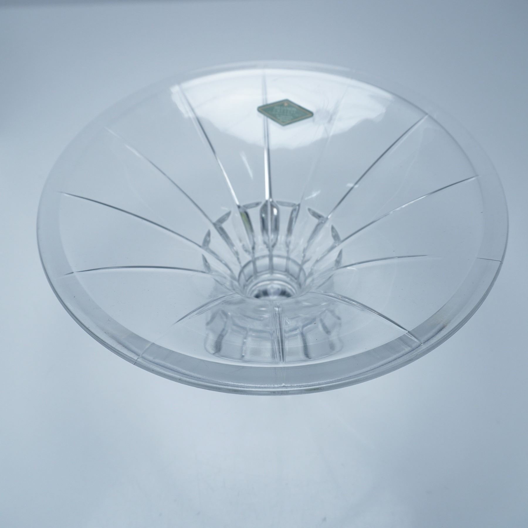 A lead crystal footed bowl, featuring a vertical cut design. The flared shape and faceted base. Retains its original label and is presented in its original box.