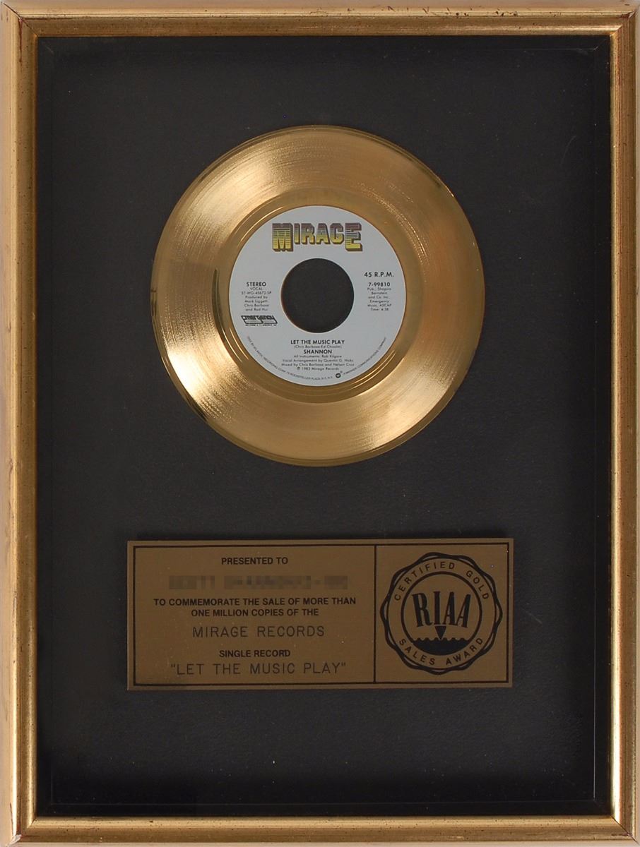 Official strip plate-style RIAA gold sales award presented “to commemorate the sale of more than one million copies of the Mirage Records single record ‘Let the Music Play.’” Framed with its disc and plate to an overall size of 13.25 x 17.25. Award retains its original backing with a New York Frame and Picture label. In fine condition.