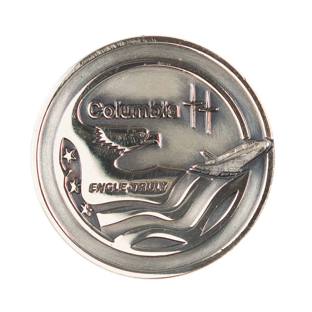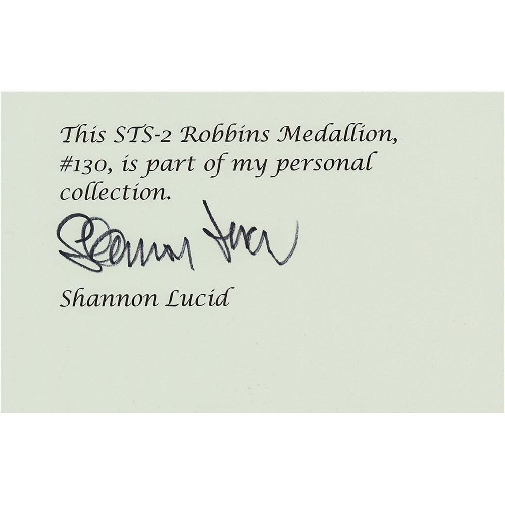 Shannon Lucid‰Ûªs unflown sterling silver STS-2 Robbins medal, approximately 1.5è in diameter, with a raised design on the face featuring the mission insignia. The reverse is encircled by the names of the astronauts, "Joe H. Engle" and "Richard H. Truly," and is engraved with the launch date of November 12, 1981, and landing date of November 14, 1981. The medal, which is serial numbered "130" on the rim, includes its original case. Condition is mint state. Accompanied by a signed letter of authenticity from Lucid, who states that the medal is from her personal collection.