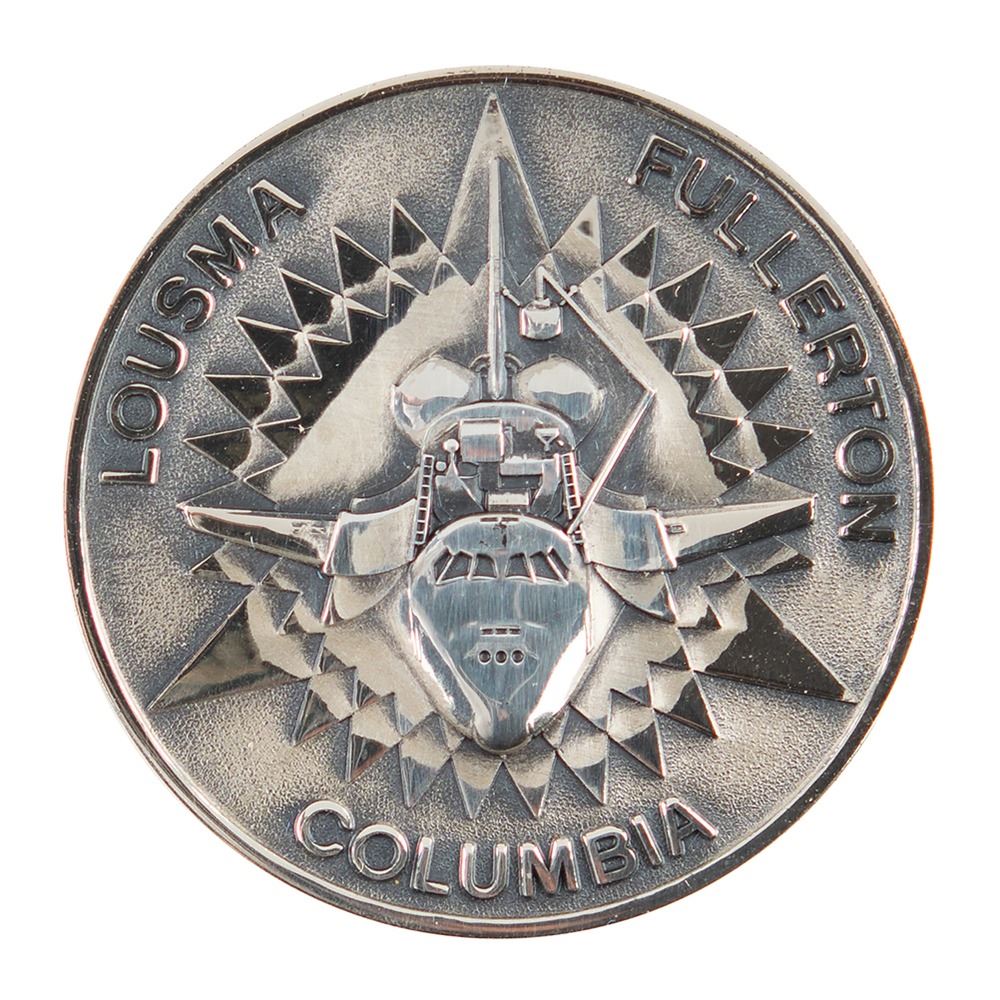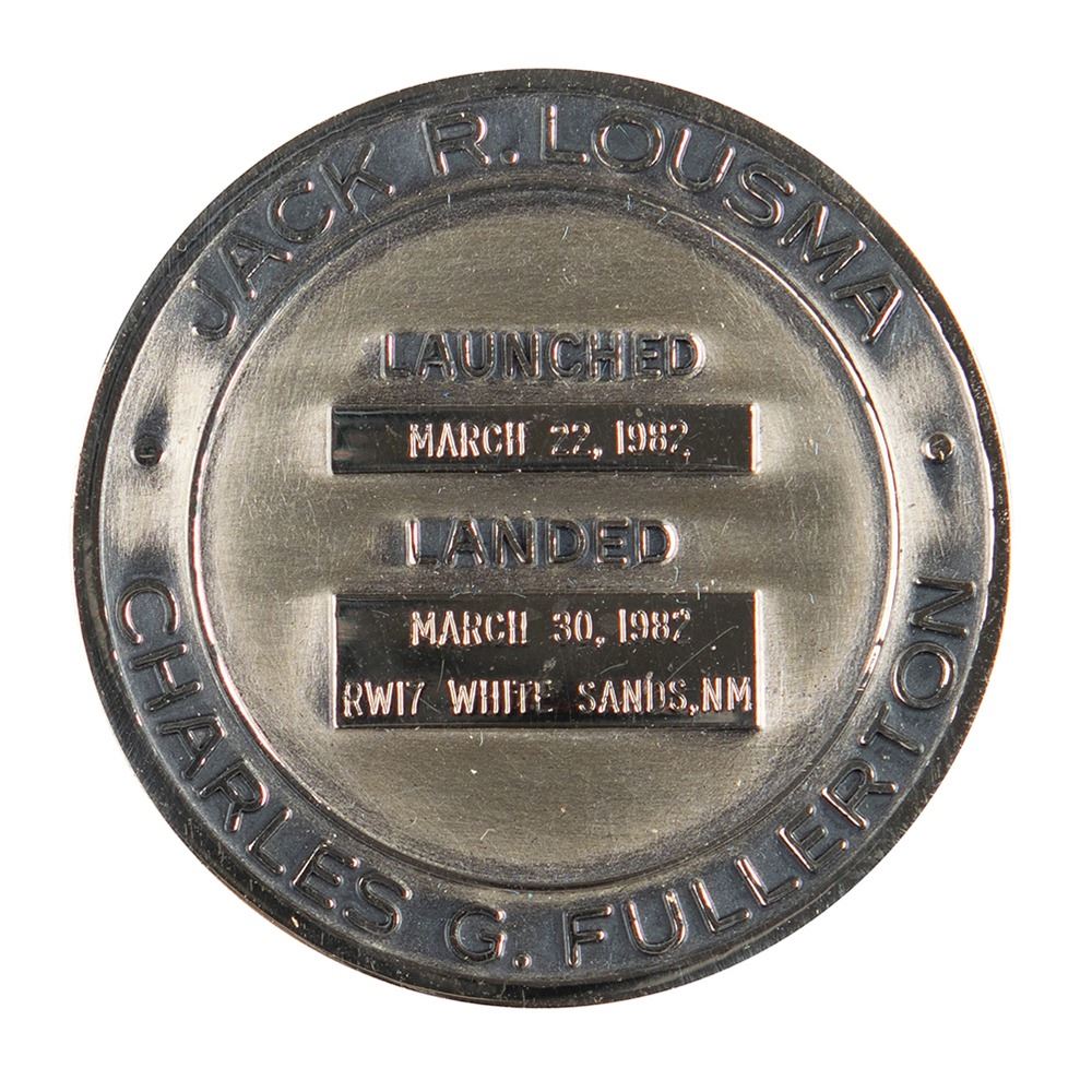 Shannon Lucid’s unflown sterling silver STS-3 Robbins medal, approximately 1.5Ë in diameter, with a raised design on the face featuring the mission insignia. The reverse is encircled by the names of the astronauts, "Jack R. Lousma" and “Charles G. Fullerton,†and is engraved with the launch date of March 22, 1982, and landing date of March 30, 1982. The medal, which is serial numbered "107" on the rim, includes its original case. Condition is mint state. Accompanied by a signed letter of authenticity from Lucid, who states that the medal is from her personal collection.