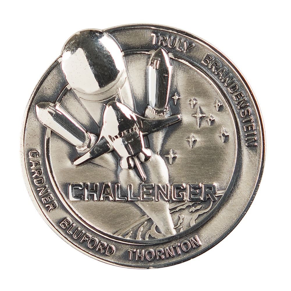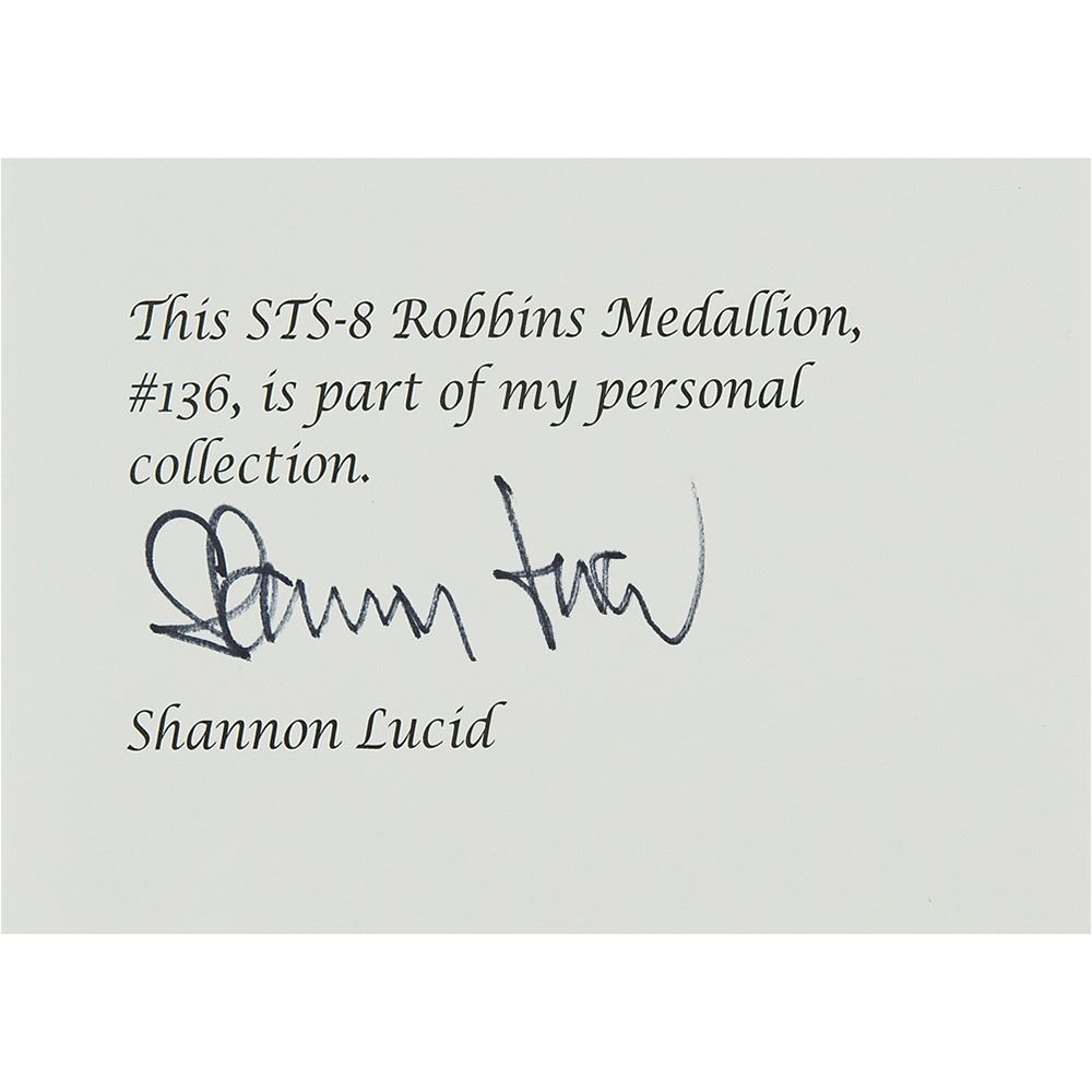Shannon Lucid‰Ûªs unflown sterling silver STS-8 Robbins medal, approximately 1.5è in diameter, with a raised design on the face featuring the mission insignia. The reverse is encircled by the names of the five astronauts and is engraved with the launch date of August 30, 1983, and the landing date of September 5, 1983. The medal, which is serial numbered "136" on the rim, includes its original case. Condition is mint state. Accompanied by a signed letter of authenticity from Lucid, who states that the medal is from her personal collection.