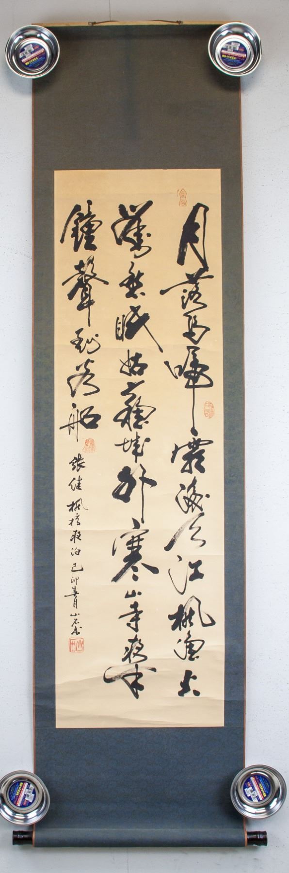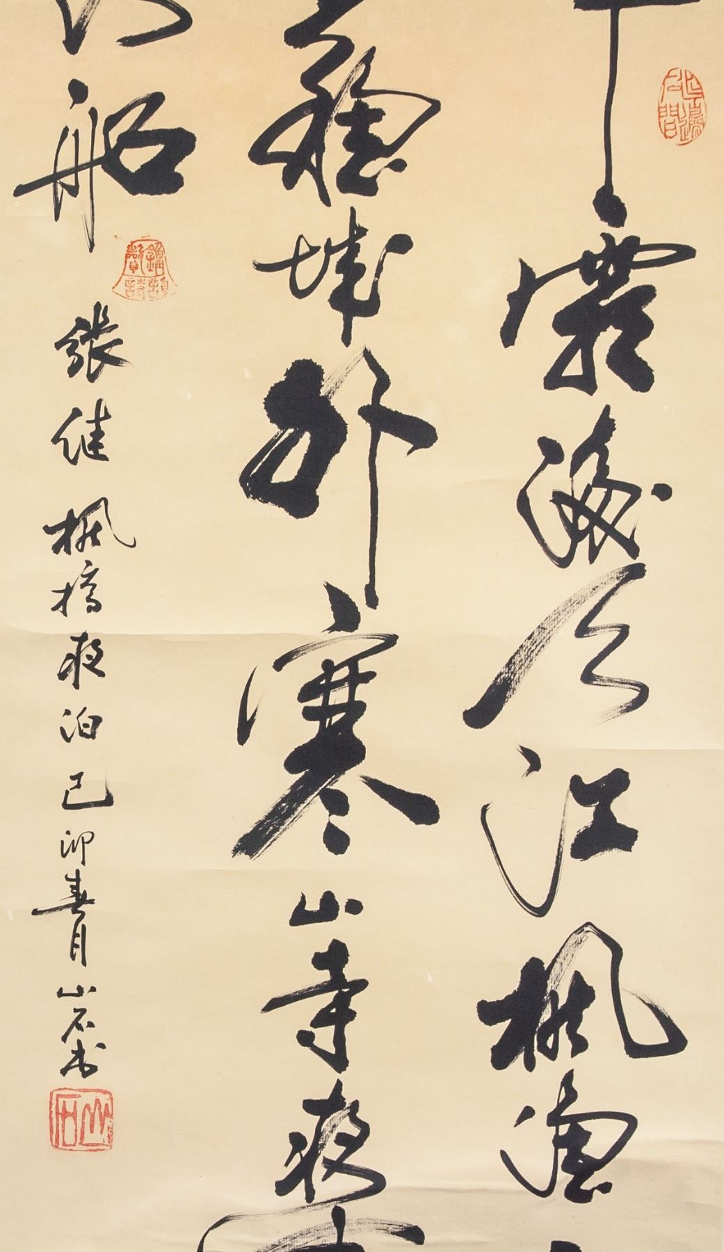 Chinese calligraphy of poem in cursive script; Chinese ink on paper; hanging scroll; signed Shanshi (aka Sun Decai, b.1936, Chinese). Inscribed with 4 artist seals; fold marks. 107 x 32 cm