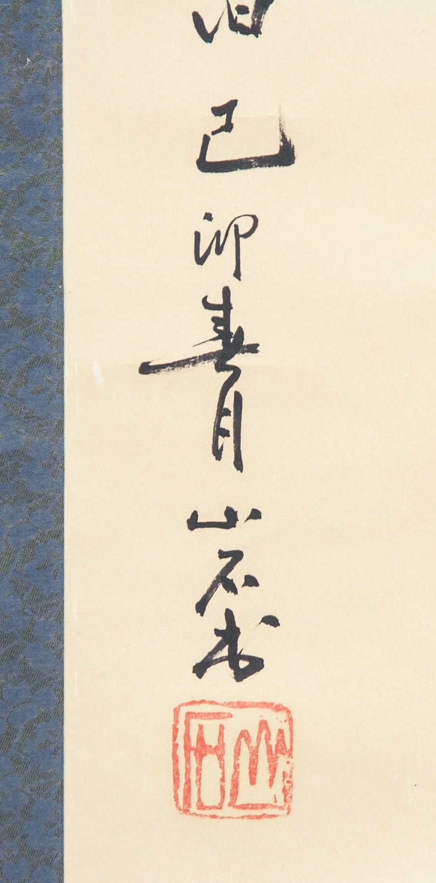 Chinese calligraphy of poem in cursive script; Chinese ink on paper; hanging scroll; signed Shanshi (aka Sun Decai, b.1936, Chinese). Inscribed with 4 artist seals; fold marks. 107 x 32 cm