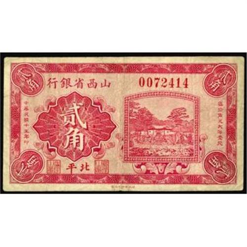 <style type="text/css"> body, td, th { font-family: Arial, Helvetica, sans-serif; font-size: 12px; color: #482424; margin: 0px; padding: 0px; } #header { background-image: url(http://www.bowersandmerena.com/ebay/images/template_v3_01.gif); clear: both; background-color: #590303; border-top-width: 2px; border-top-style: solid; border-top-color: #B38C4F; } #header #header_wrapper { height: 75px; clear: both; width: 800px; margin-right: auto; margin-left: auto; background-image: url(http://www.bowersandmerena.com/ebay/images/template_v3_03.gif); background-repeat: no-repeat; background-position: right; color: #F3EDCC; } #header #header_wrapper #header_logo { float: left; height: 75px; width: 444px; background-image: url(http://www.bowersandmerena.com/ebay/images/template_v3_02.gif); background-repeat: no-repeat; font-size: 10px; text-transform: capitalize; color: #B38C4F; } #header #header_wrapper #header_right { float: left; height: 75px; width: 356px; text-align: right; } #header #header_wrapper #header_right #headerLoginBtn { margin-bottom: 30px; } #header #header_wrapper #header_right input#txtSearch { color: #B49056; border: 1px solid #B49056; width: 175px; padding-top: 3px; padding-right: 3px; padding-bottom: 4px; padding-left: 3px; } #nav { height: 37px; background-image: url(http://www.bowersandmerena.com/ebay/images/template_v3_05.gif); clear: both; } #nav #nav_wrapper { height: 35px; width: 800px; margin-right: auto; margin-left: auto; border-left-width: 1px; border-left-style: solid; border-left-color: #B38C4F; } #nav #nav_wrapper a { padding-right: 15px; padding-left: 15px; border-right-width: 1px; border-right-style: solid; border-right-color: #B38C4F; height: 25px; padding-top: 10px; display: block; float: left; text-decoration: none; font-weight: bold; color: #5D0303; } #nav #nav_wrapper a:hover { color: #B38C4F; } #nav #nav_wrapper #search { float: right; padding-top: 7px; } #nav #nav_wrapper #search #txtSearch { font-family: Arial, Helvetica, sans-serif; font-size: 10px; text-transform: uppercase; color: #D2AE75; border: 1px solid #B38C4F; padding: 3px; } #content_bgd { background-image: url(http://www.bowersandmerena.com/ebay/images/template_v3_09.gif); background-repeat: repeat-y; background-position: center; padding-top: 15px; padding-bottom: 15px; background-color: #FBFBDB; } #content_wrapper { clear: both; height: auto; width: 800px; margin-right: auto; margin-left: auto; } .LotDetailWhite { line-height:normal; font-size:13px; font-family: arial,helvetica,sans-serif; color: White; font-weight: bold; } .LotDetailInformation { line-height:normal; font-size: 13px; font-family: arial,helvetica,sans-serif; } .LotDetailMessage { line-height:normal; font-size: 13px; font-family: arial,helvetica,sans-serif; color: red; } } tr.HeaderAuctionTitle td { color: #000000; font-weight: bold; padding: 2px; background-image: url(http://www.bowersandmerena.com/ebay/images/template_v3_05.gif); background-repeat: repeat-x; border-bottom-width: 1px; border-bottom-style: solid; border-bottom-color: #B38C4F; } table.AuctionSummary a, table.AuctionSummary a:link, table.AuctionSummary a:visited { color: #0000FF; text-decoration: none; } } td.tableHeaderLeft { border-left-width: 1px; border-left-style: solid; border-left-color: #B38C4F; } td.tableHeaderRight { border-right-width: 1px; border-right-style: solid; border-right-color: #B38C4F; } td.tableCellMiddle { border-left-width: 1px; border-left-style: solid; border-left-color: #B38C4F; border-right-width: 1px; border-right-style: solid; border-right-color: #B38C4F; padding: 5px; } tr.footer td { border-top-width: 1px; border-top-style: solid; border-top-color: #B38C4F; } </style> </head> <body> <div id="header"> <div id="header_wrapper"> <div id="header_logo"> </div> <div id="header_right"> </div> </div> </div> <div id="nav"> <div id="nav_wrapper"> <a href="http://www.bowersandmerena.com">Our eBayLive Auctions</a> <a href="#PaymentInfo">Payment Information</a> <a href="#ShippingInfo">Shipping Information</a> <a href="#About">About Bowers and Merena</a> </div> </div> <div id="content_bgd"> <div id="content_wrapper"> <table width="100%" border="0" cellpadding="5" cellspacing="0" class="AuctionSummary"> <tbody> <tr class="HeaderAuctionTitle" style="height: 25px;"> <td align="left" class="tableHeaderLeft" > </td> <td align="center" class="tableHeaderRight"> <span style="font-size: large;">Lot #710. Provincial Banks. Shansi Provincial Bank, 1926 Issue.</span> </td> </tr> <tr> <td colspan="3" class="tableCellMiddle"> 1926. Peiping, 20 cents, P-S2639 Unlisted Place Name Peiping., Fine condition.