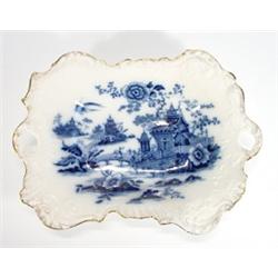 Shaped rectangular Willow patterned serving dish, various marks to back, 32cm in length…