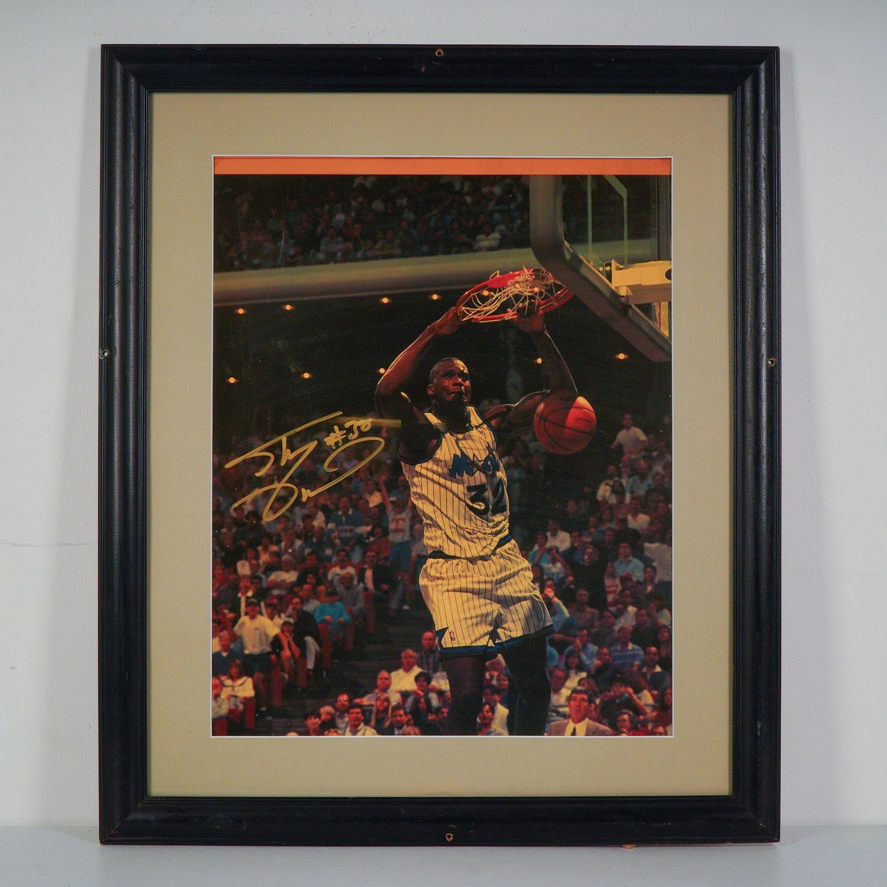A spectacular framed and signed photograph capturing NBA legend Shaquille O'Neal in his dominant early years with the Orlando Magic. The image shows Shaq mid-dunk, wearing the iconic #32 pinstriped Magic uniform, with his powerful presence on full display. Shaquille O'Neal's autograph remains one of the most sought-after in the hobby, especially on action shots from his rookie-era Magic days. Signed boldly in gold marker with his jersey number, this piece is a striking tribute to one of basketball's most unstoppable forces. Presented in a black frame with cream matting, the photograph is ready for display and makes an outstanding addition to any sports memorabilia collection.