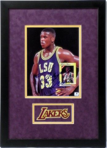 For basketball fans, there may be no greater star than Shaq (Shaquille O'Neal). This is a luxurious mounted celebration of his roots. Dominating this purple backed display is the young Shaquille wearing his LSU 33 jersey with an insert Beckett "Future Stars" card in the photo. The photo itself is personally signed by Shaquille. It also includes a beautiful mounted LAKERS logo. All is double mounted and matted in gold. The Shaquille signed LSU photo is 8"x10", and the LAKERS logo is 5.5"x3". The professionally mounted frame is 16"x23".