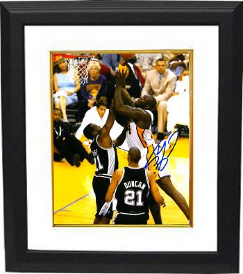 After four years with the Magic, Shaquille O'Neal signed as a free agent with the Los Angeles Lakers. They won three consecutive championships in 2000, 2001, and 2002. O'Neal's individual accolades include the 1999–2000 MVP award, the 1992–93 NBA Rookie of the Year award, 15 All-Star game selections, three All-Star Game MVP awards, three Finals MVP awards, two scoring titles, 14 All-NBA team selections, and three NBA All-Defensive Team selections. He is one of only three players to win NBA MVP, All-Star game MVP and Finals MVP awards in the same year (2000). Shaquille O'Neal has hand signed this Los Angeles Lakers 8x10 Photo vs the Spurs. Certificate of Authenticity from Athlon Sports. Custom White Mat and Premium Black Color Framed as shown.