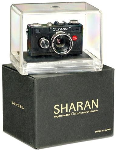 "Sharan: Contax I" (schwarz) Nr. K00193, für Minox-Film (8 x 11 mm), "Mega House Mini Classic Camera Collection". Mit Anleitung (japanisch), Plexiglasbehälter, Verpackung und Objektivdeckel. - Äußerst selten!