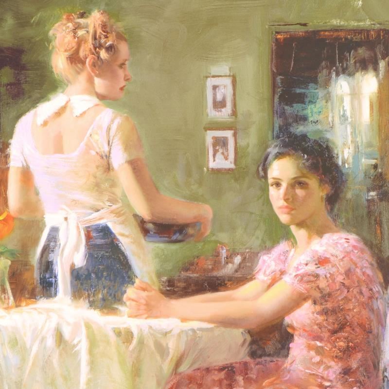 "Sharing Moments" is a limited edition giclee on paper by Pino (1939-2010). The piece comes numbered and is hand signed by the artist. Includes Certificate of Authenticity. Measures approximately 20 x 16" (image).