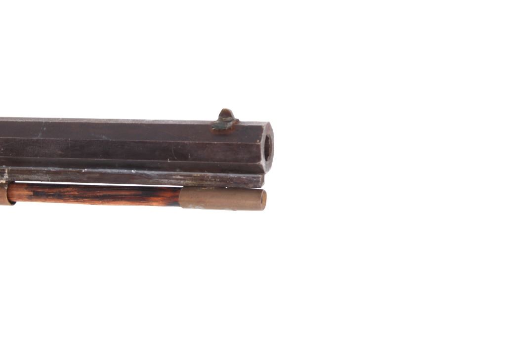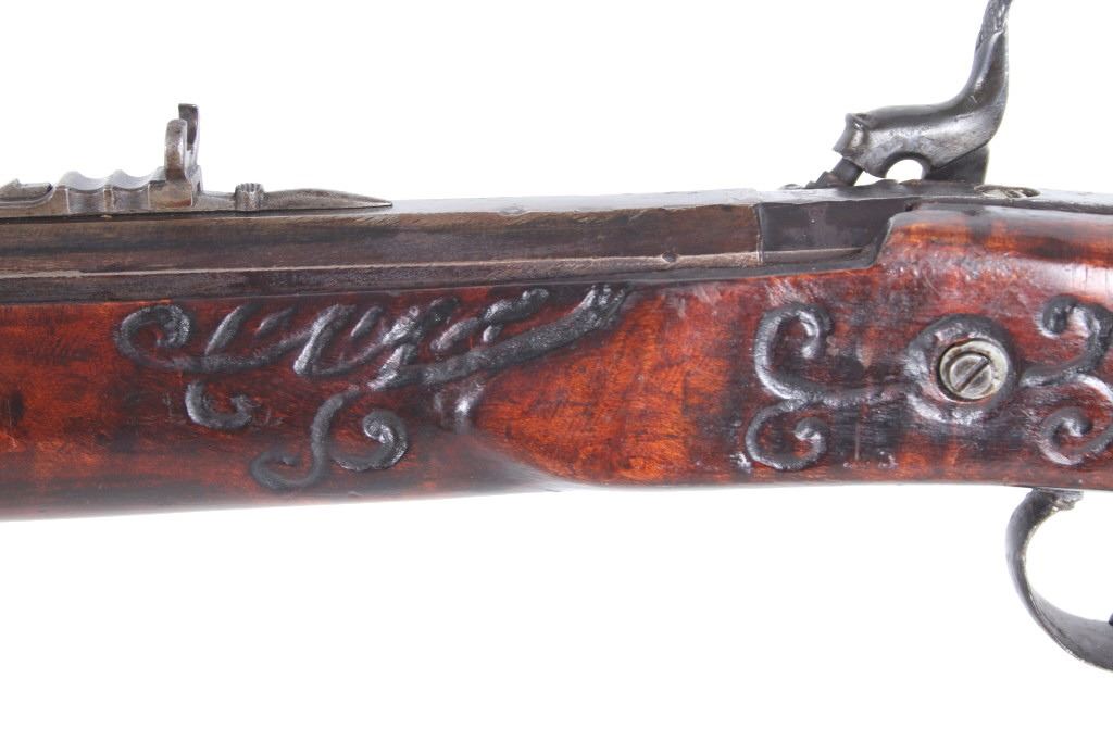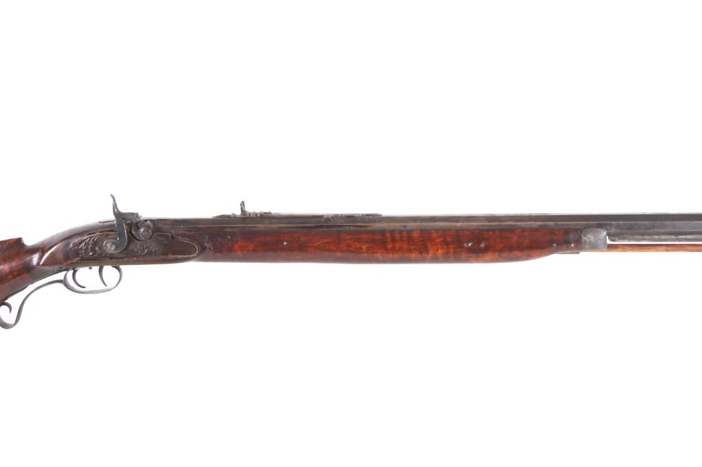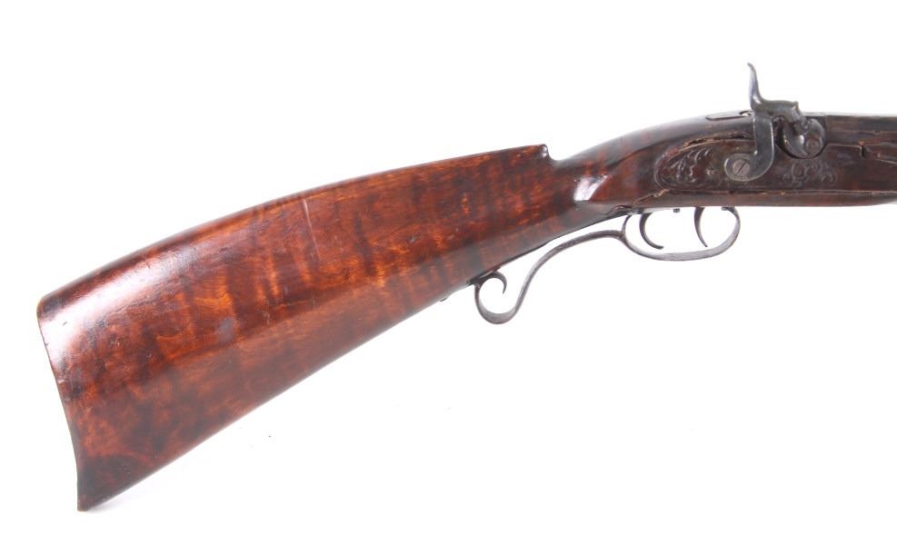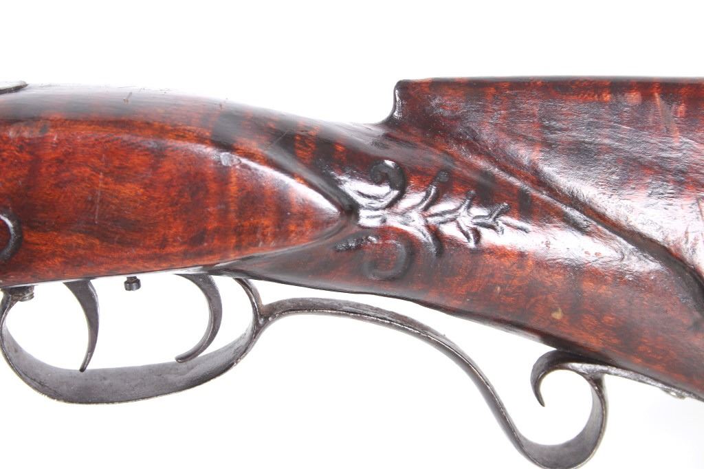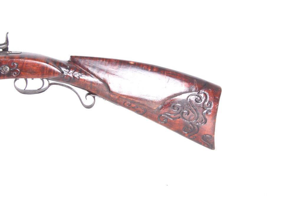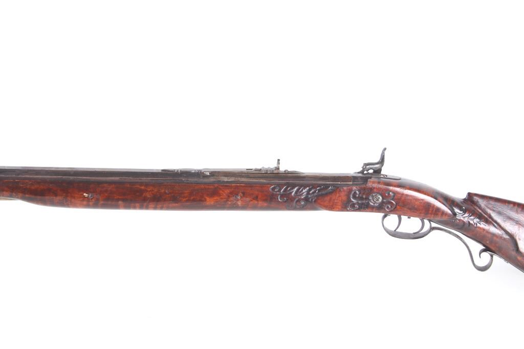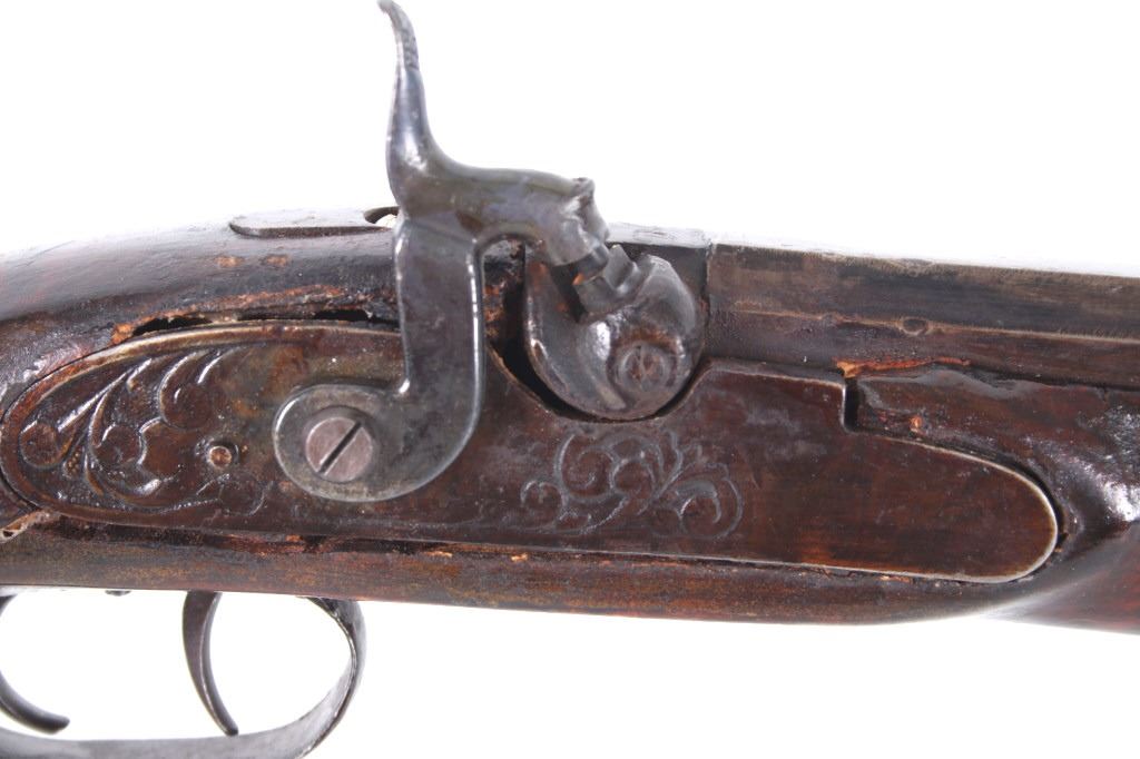 Featured in this lot we have a Sharon Barrel Co black powder percussion cap rifle chambered in .45 caliber. The rifle displays a 42" long octagonal barrel, maple half stock, steel trigger guard, dual trigger system, etched lock plate and hammer system, and blue'd finish. The barrel is marked across the top reading "SHARON BARREL CO". The lock plate displays etched floral designs in the front and back of the plate. The stock shows carved vine designs with a half length stock along the barrel. Mechanically the rifle displays a working dual trigger system and tight hammer action. The rifle shows a brass blade front sight and adjustable rear sight. The rifle shows fair condition overall with some wear due to age and damage to the stock around the lock plate and trigger guard. No Serial Number. This firearm qualifies as an Antique, and does not require FFL Transfer or NICS Background Check.